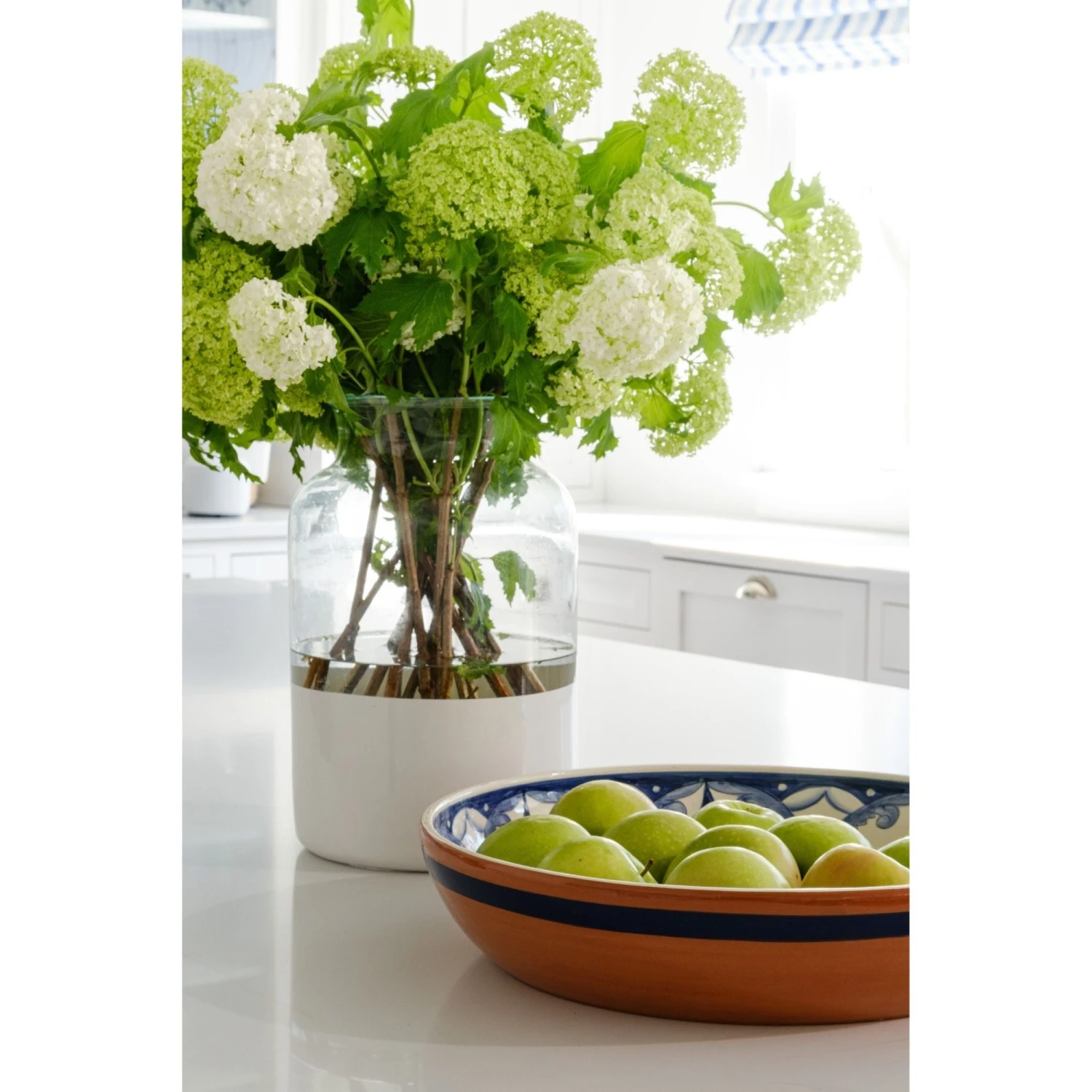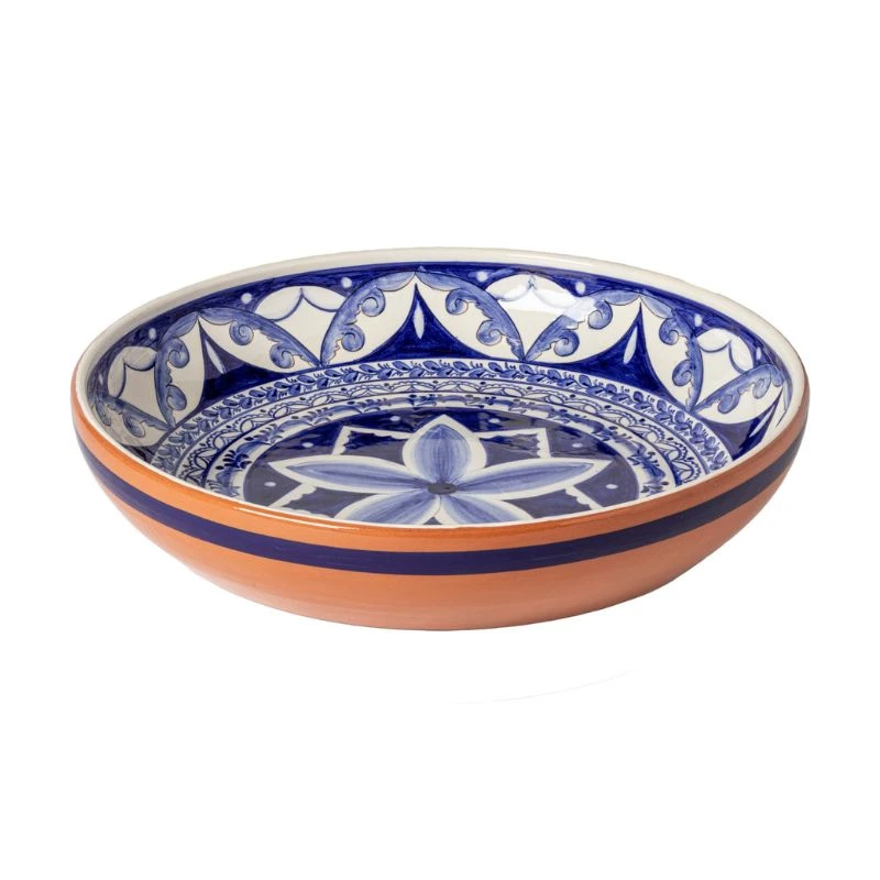 This stunning piece, crafted from durable terracotta, showcases an exquisite hand-painted blue and white motif that captures the essence of Mediterranean elegance. With its generous size and striking design, this serving bowl effortlessly doubles as a standalone centerpiece, commanding attention and admiration in any setting.