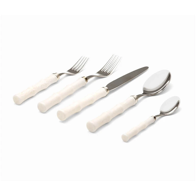 Make every meal feel even more elegant with the Amagansett Faux Ivory Flatware Set. Designed by Mark D. Sikes, a renowned interior designer, each piece features a bamboo-shaped imitation ivory acrylic handle with stainless steel cutlery. The faux ivory-handled silverware set comes with five utensils: a knife, dinner fork, salad fork, soup spoon and tea spoon.