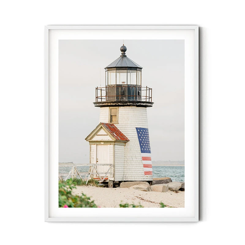 The American Flag on Brant Point Lighthouse print offers a stylish way to outfit your home with timeless coastal artwork. Photographer Zofia Crosby has beautifully captured this Nantucket landmark with a patriotic American flag painted on the side. This Brant Point lighthouse photo is available in multiple sizes, with each print featuring archival ink printed on high-quality, acid-free fine art paper with a smooth finish.