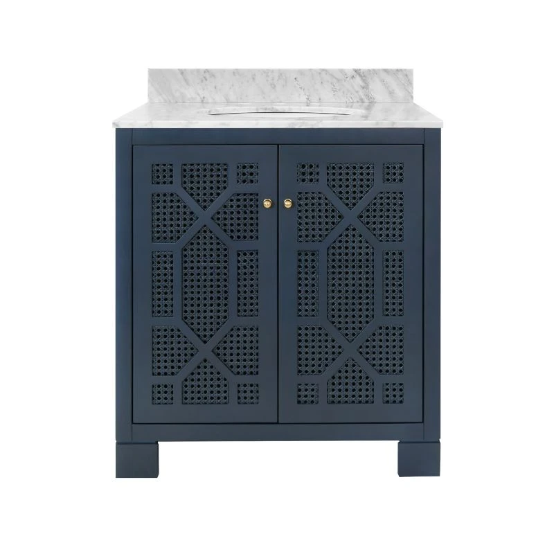 Crafted with attention to detail, the Anguilla Bathroom Vanity showcases handwoven cane front doors, adding a touch of artisanal charm to your daily routine. Designed for those who value both style and convenience, this freestanding masterpiece features a luxurious Carrara marble top, porcelain sink, and polished brass knobs, radiating a timeless coastal aesthetic with a contemporary edge.