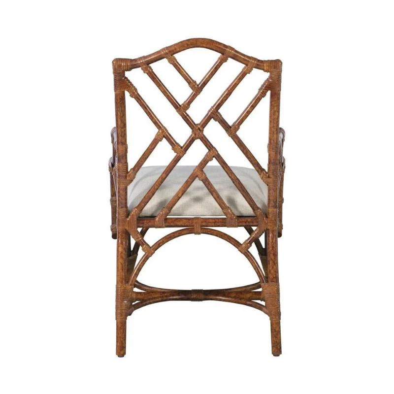 Charm and craftsmanship collide in our Antiqued Chippendale Arm Chair, which brings a faraway feel home. Fashioned from natural rattan and featuring a plush cushion and perchable arm rests, the seat is hard to beat for breezy vibes.