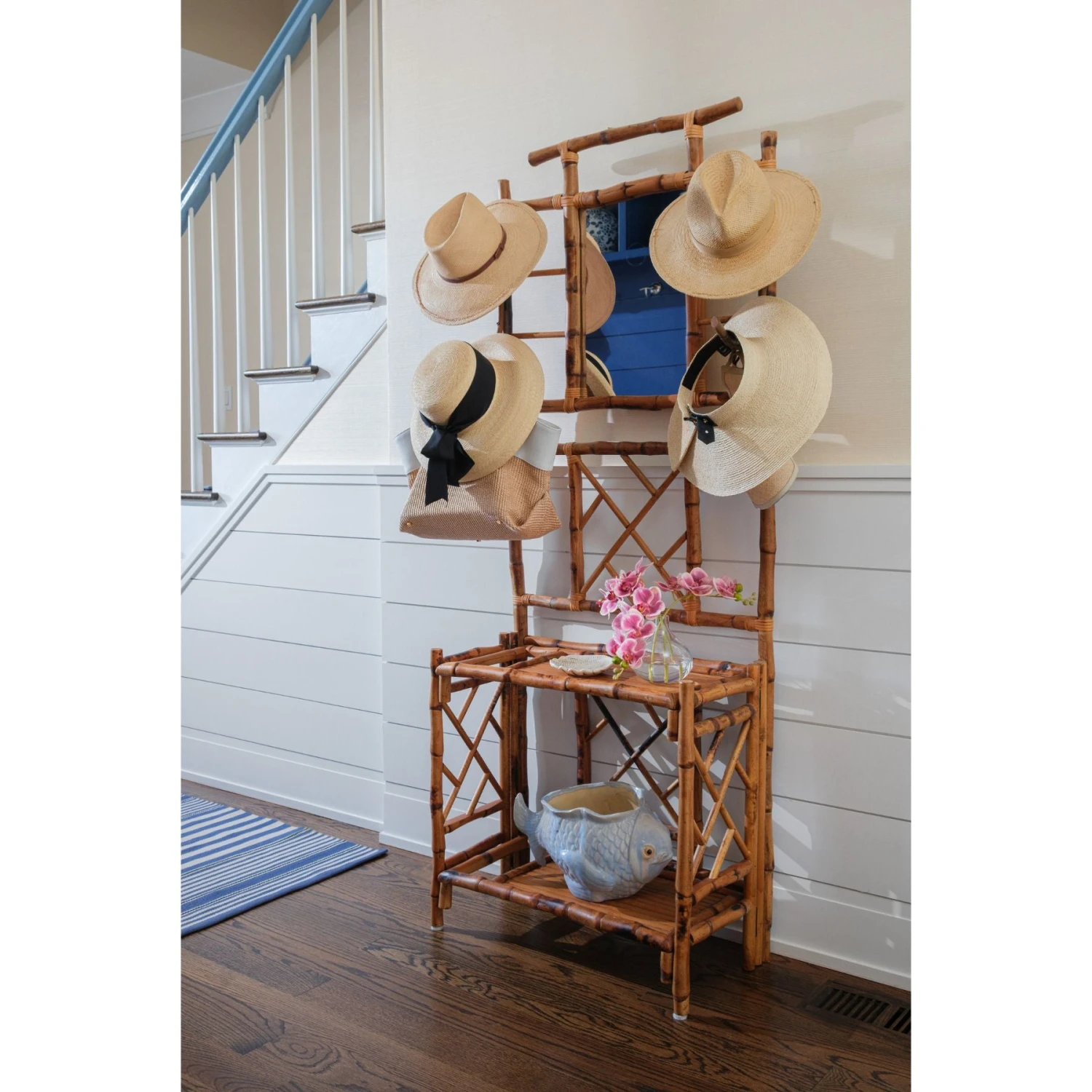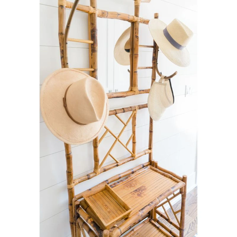 Part console, part coat rack, our multipurpose Antiqued Hall Tree is no ordinary piece of furniture. Its multifunctional uses allow for practical storage while creating an island tableau for all your curio. Hooks for coats and hats are combined with surface space for keys, purses and other accessories. Fashioned from tortoise rattan, this vintage hall tree adds a tactile quality to any hallway or foyer. With its coastal styling, it creates a relaxed and inviting atmosphere from the moment you walk in the door.
