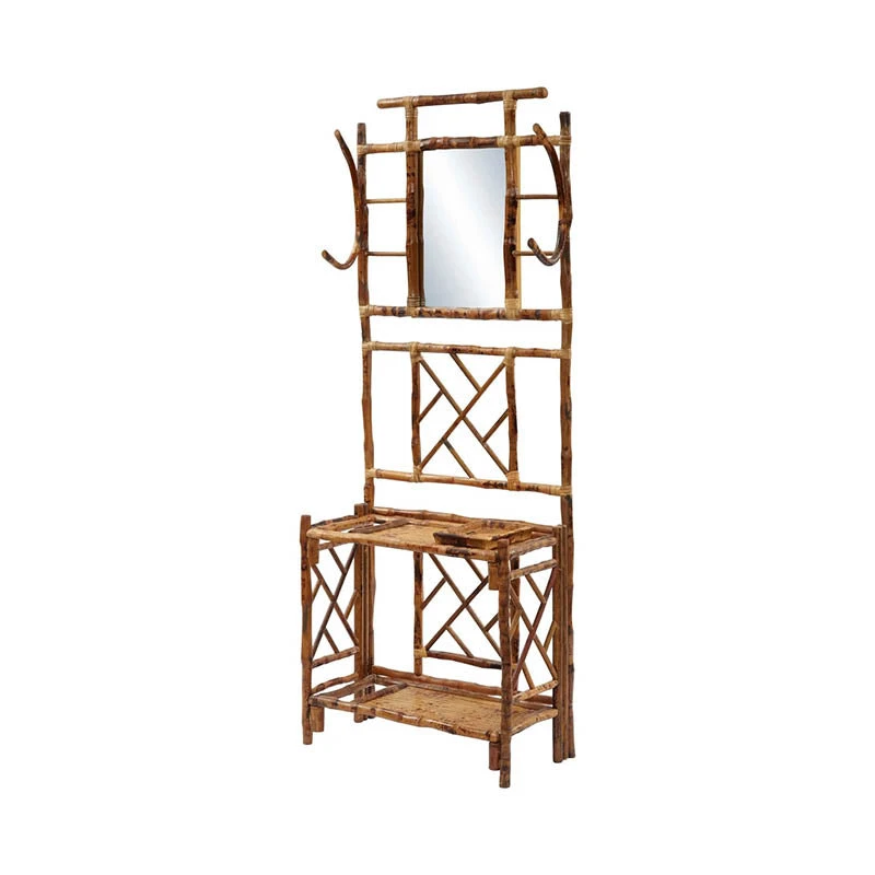 Part console, part coat rack, our multipurpose Antiqued Hall Tree is no ordinary sidepiece – it creates an island tableau for all your curio. Fashioned from tortoise rattan, the furniture adds a tactile quality to any hallway or foyer. Constructed from natural materials, this piece may have minor variations in color, texture, and beauty marks, which enhances its natural charm.