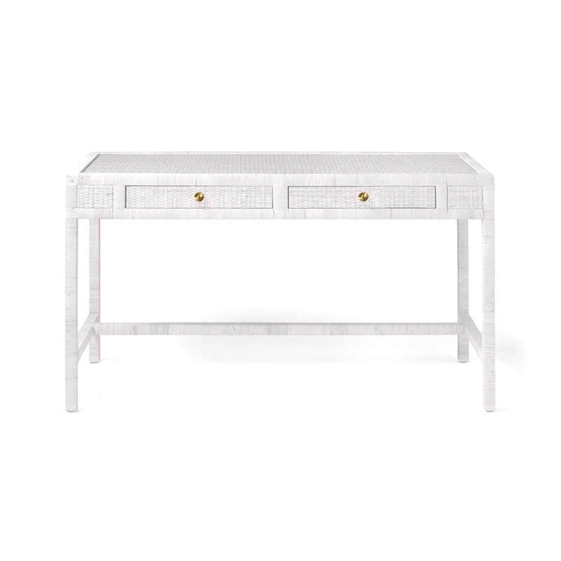 Our Avalon Desk delivers a coastal effect right at home. Fashioned from tightly woven peeled rattan and reinforced by a box-stretcher frame, the piece is as relaxed as it is rigid. Soft-close front drawers are finished with a dark gray stained wood interior and feature flower-patterned gold knobs. Constructed from natural materials, this piece may have minor variations in color, texture, and beauty marks, which enhances its natural charm.