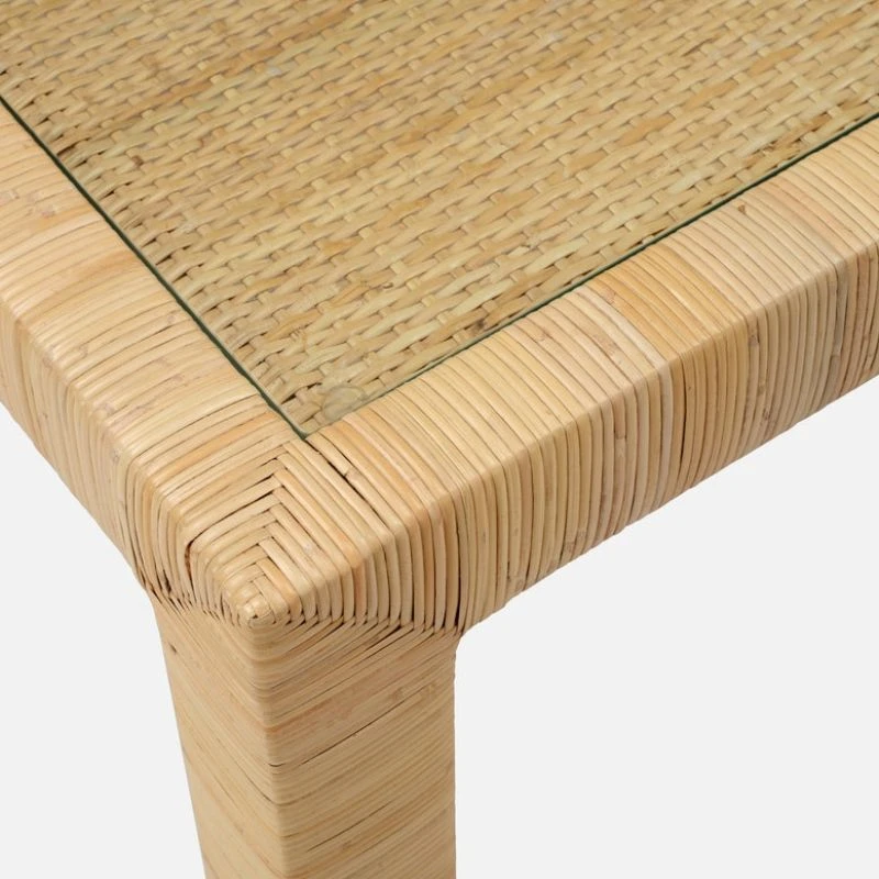 The glass tabletop beautifully showcases the intricate rattan pattern underneath, adding a touch of sophistication to any space.