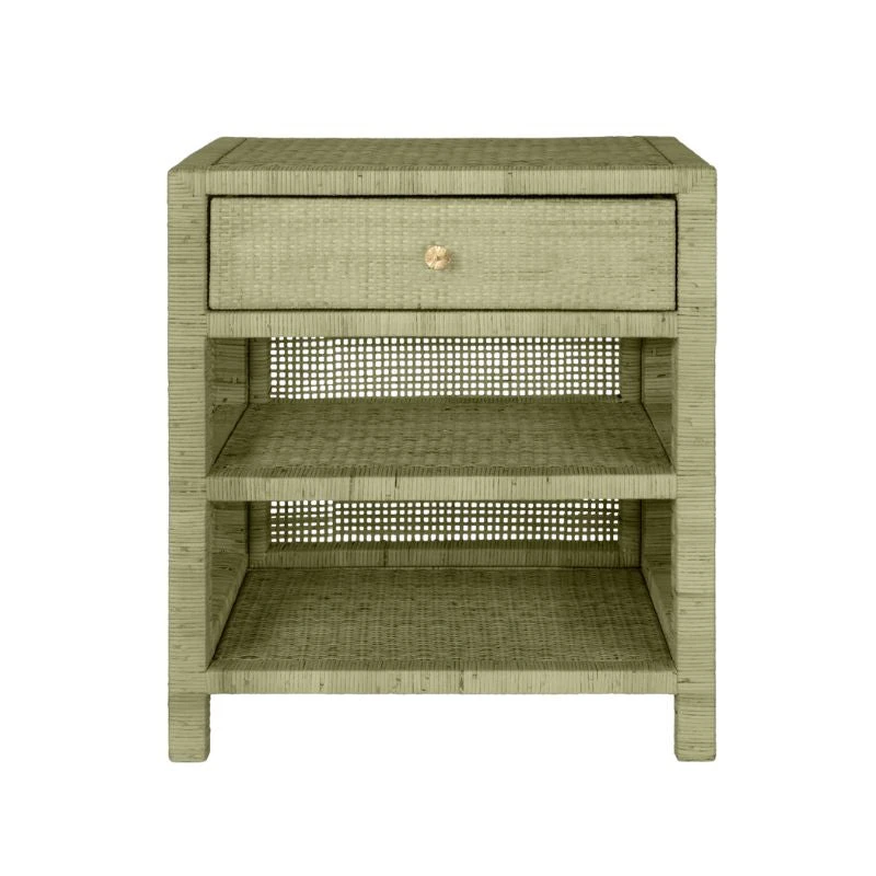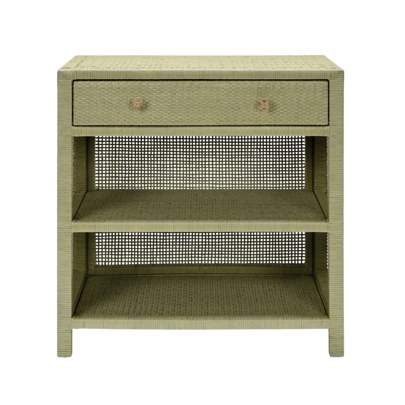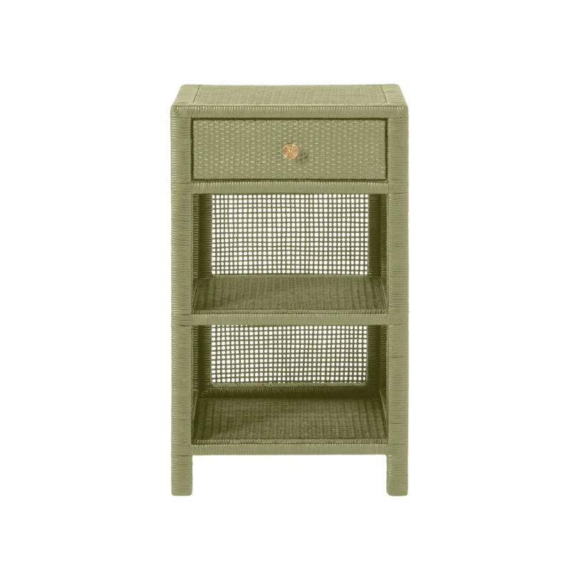 Our Avalon Nightstand is crafted from tightly wrapped, natural peeled rattan in a sage green finish. Featuring double shelves, soft-close drawers, and a flower-patterned gold knobs, this beautiful nightstand is sure to add a touch of sophistication to your bedside. Available in three sizes to suit your design preferences, the Avalon Nightstand is as versatile as it is stylish.