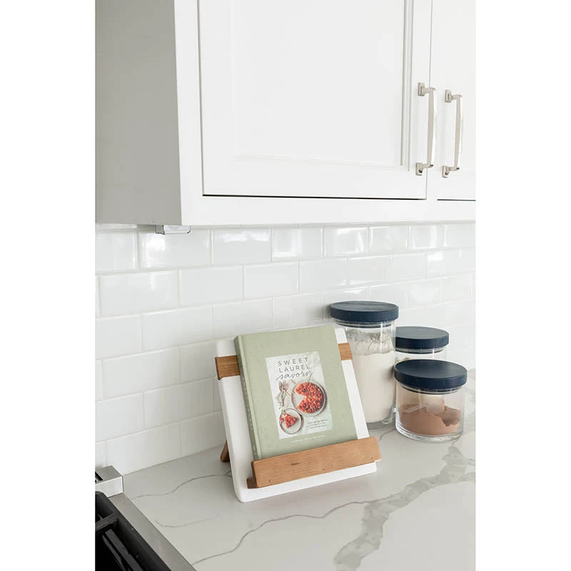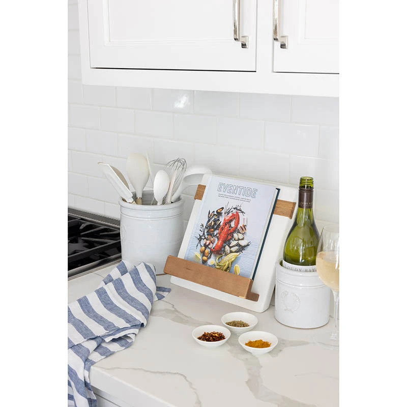 Add a pop of color to your countertop with this chic and functional white iPad and Cookbook Holder. The stand boasts a contrasting slat and shelf with lip on the stand’s angled surface to keep your page. This essential kitchen (or desk!) accessory ensures your favorite recipes (and emails) stay within sight.