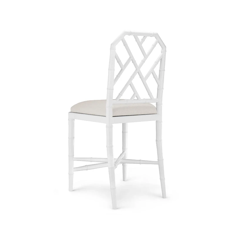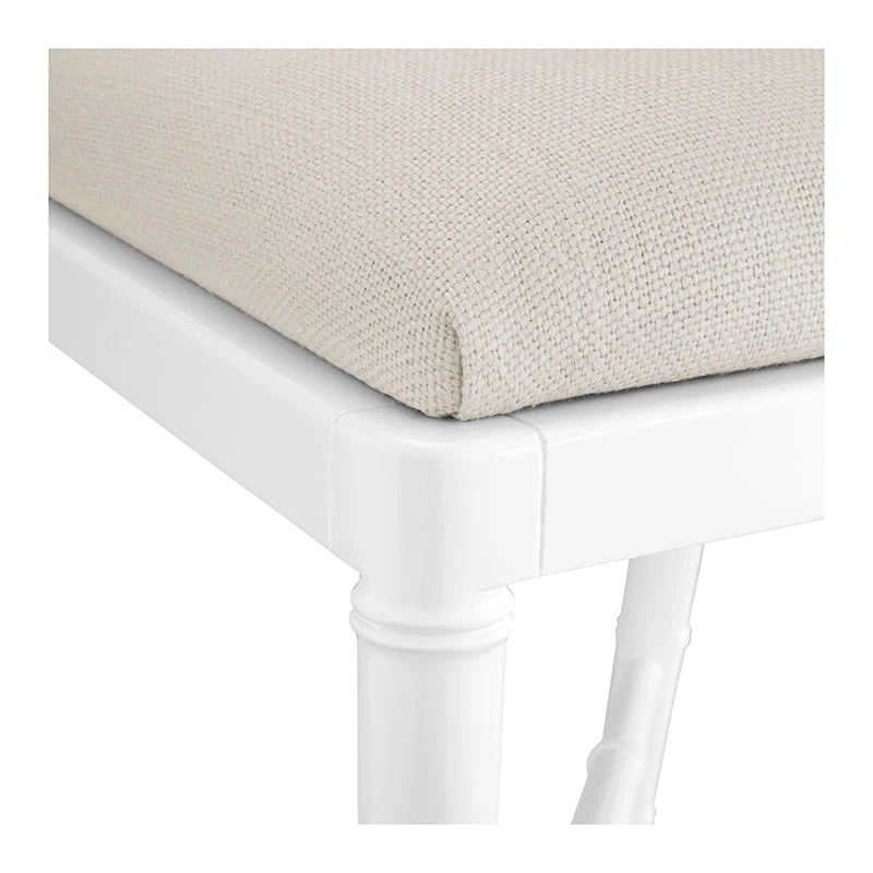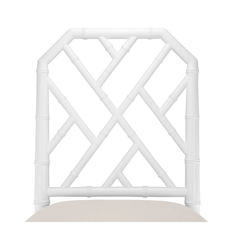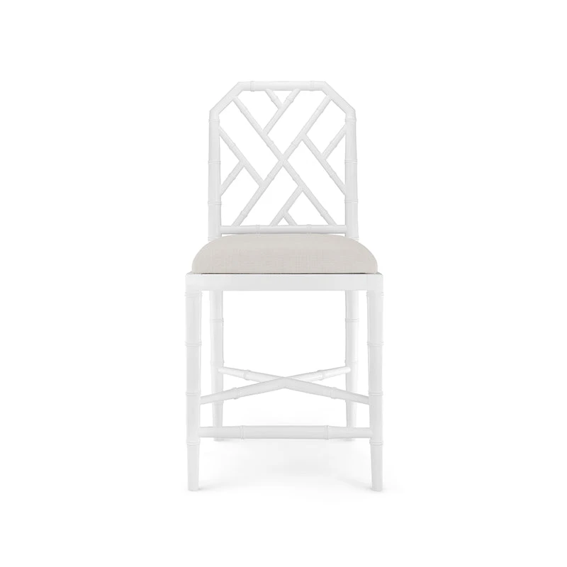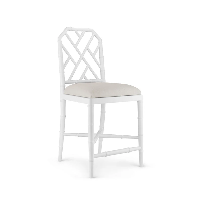 Our Bamboo Counter Stool offers a naturalistic and casual Chippendale-style with a decorative lattice fretwork, diagonal stretchers, and gently tapered legs. Made of lacquered mahogany with a white finish and completed with a linen drop in cushion, the Bamboo Counter Stool feels casual and yet undeniably upscale. Ideal for a kitchen island or home bar, this stool invites you to sit back in style.