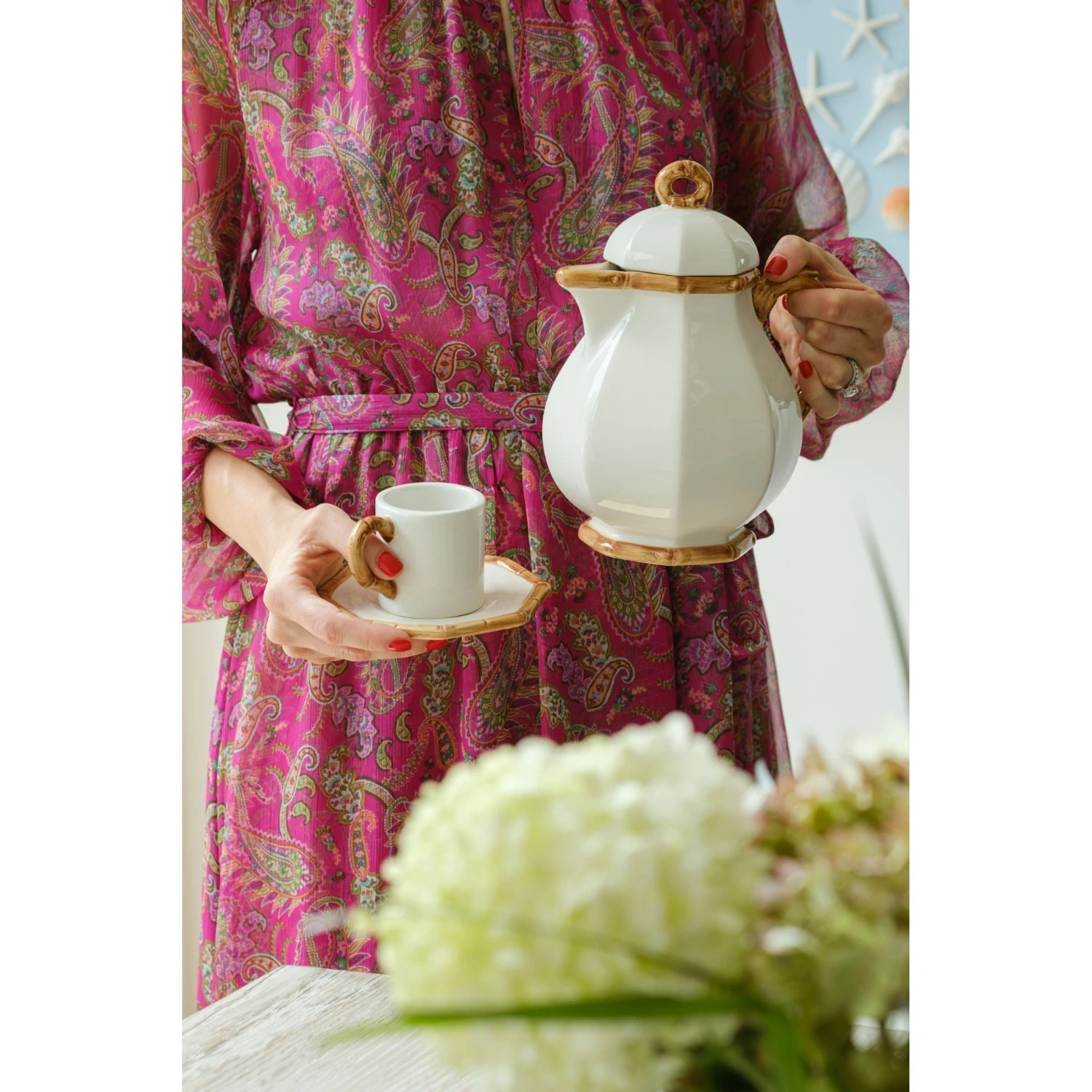 Meet our chic faux Bamboo Teapot, a masterpiece of refined elegance. Its sleek, modern silhouette is adorned with an intricate bamboo-inspired texture, adding a touch of island charm to your tea time. This handcrafted teapot seamlessly blends classic design with contemporary flair, perfect for both casual gatherings and formal occasions.