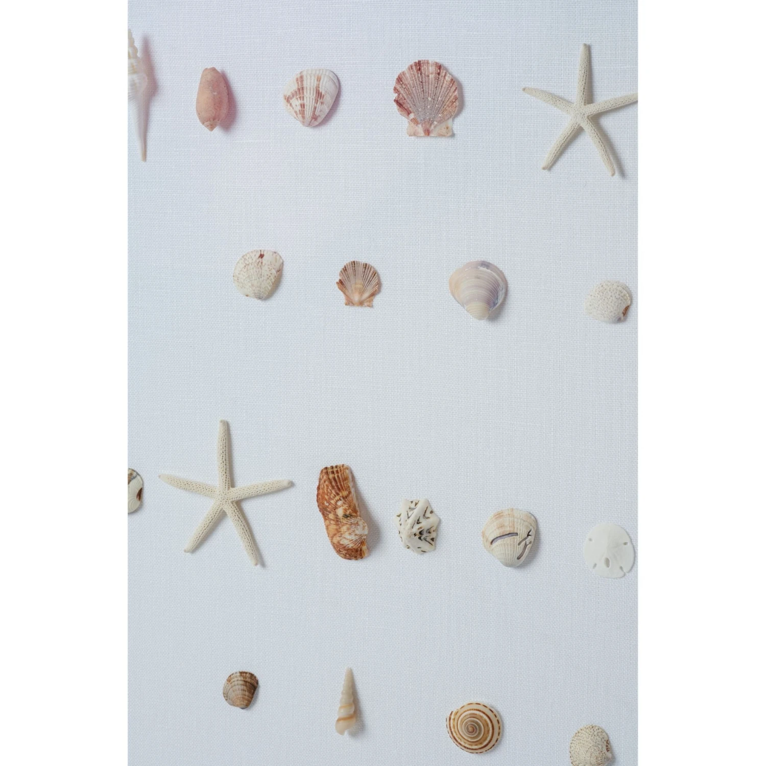 An assortment of hand-selected shells are meticulously arranged in a grid-like formation of five rows, adding depth and texture to the composition. Â