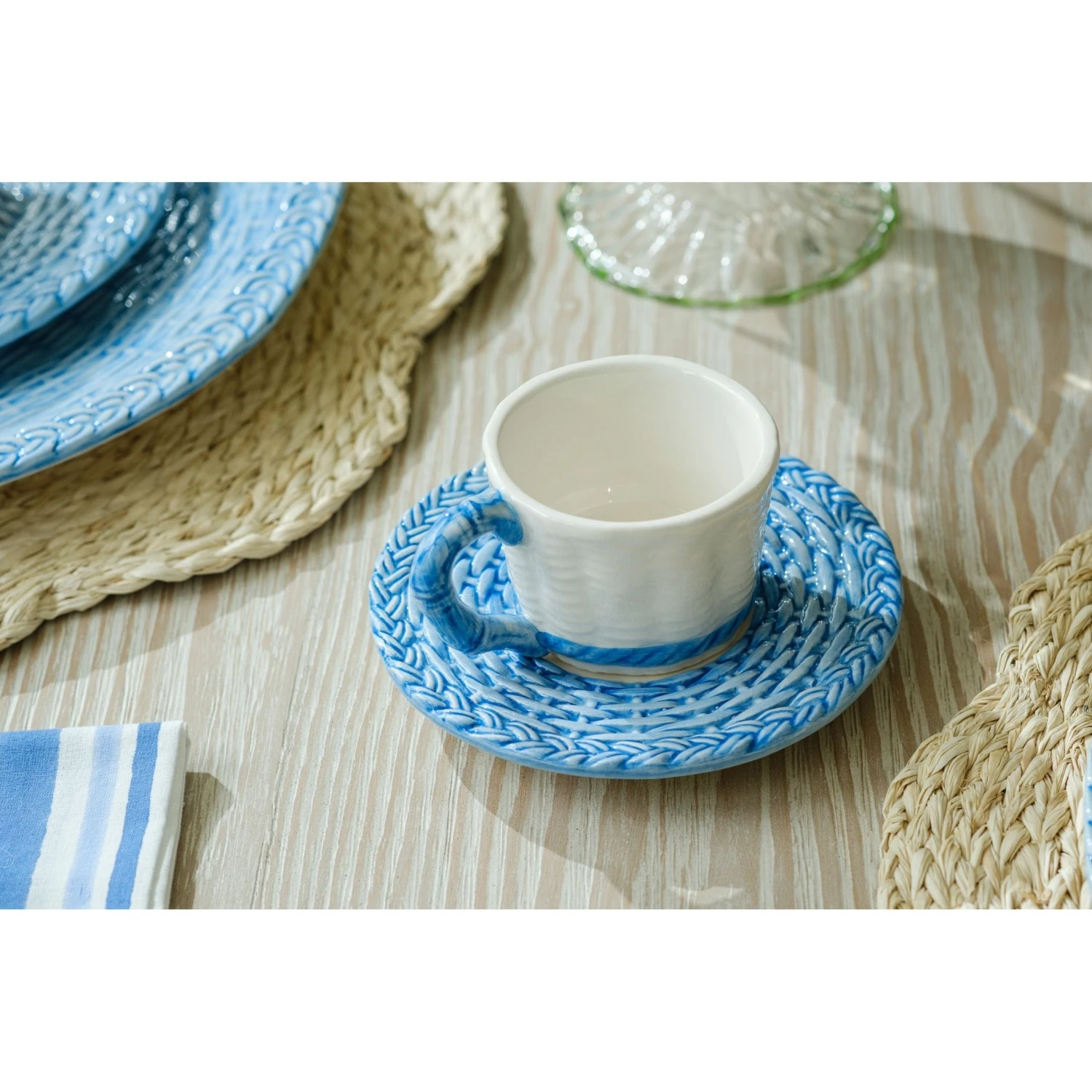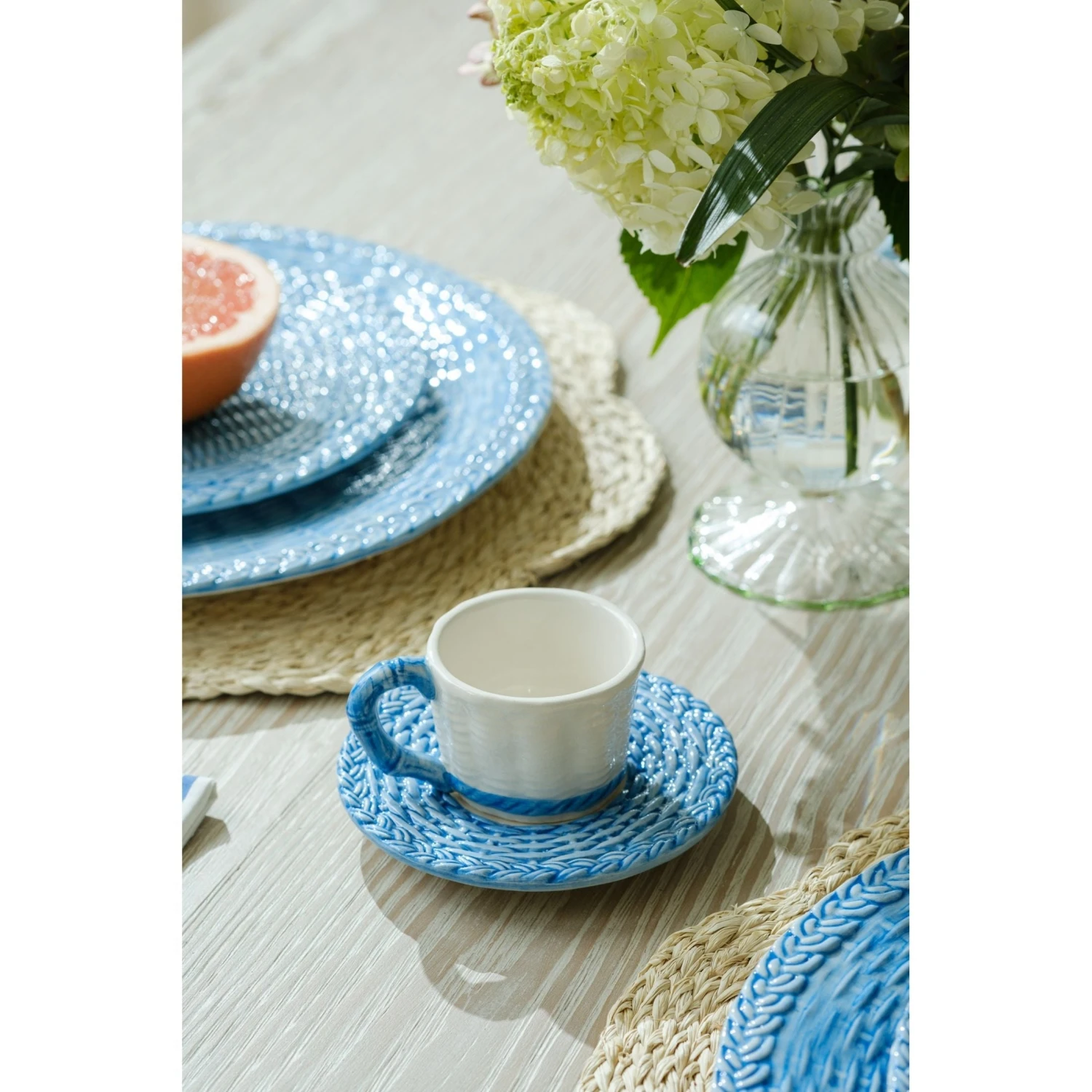 Elevate your coffee experience with our Blue Rattan Espresso Cup and Saucer, meticulously handcrafted in Italy. Designed to complement our heirloom-quality Blue Rattan Plates, this set features a charming faux rattan texture in a rich blue hue, adding a touch of coastal sophistication to your espresso moments. Perfect for a refined and stylish coffee break, these porcelain pieces seamlessly blend function with artistry.