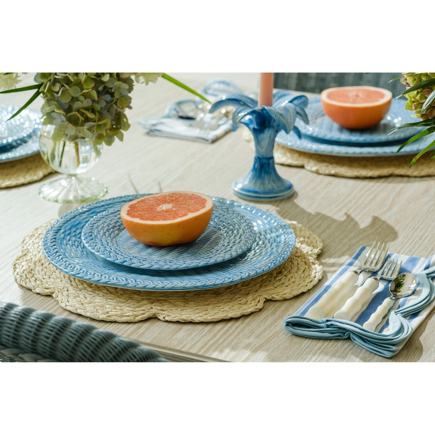 Handcrafted in Italy, our Blue Rattan Plates are a timeless addition to any china collection. With their distinctive textured faux rattan weave in a stunning blue finish, these coastal chic porcelain plates will elevate your tablescape and become the centerpiece of conversation.