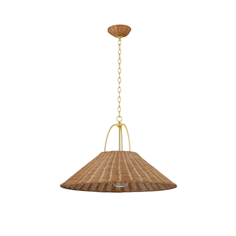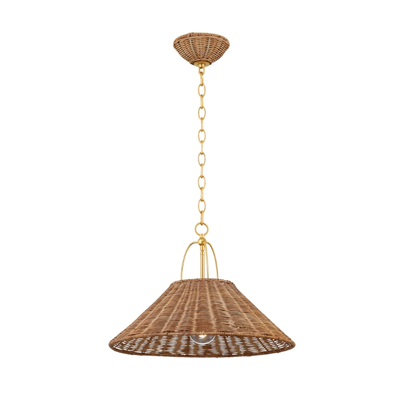 The Cardiff Pendant takes a heritage silhouette and gives it an update with contemporary materiality. Woven from Natural Rattan, the shade and canopy bring an earthy, yet sophisticated feel to a space. The unique metalwork details are finished in a timeless aged brass finish.Â