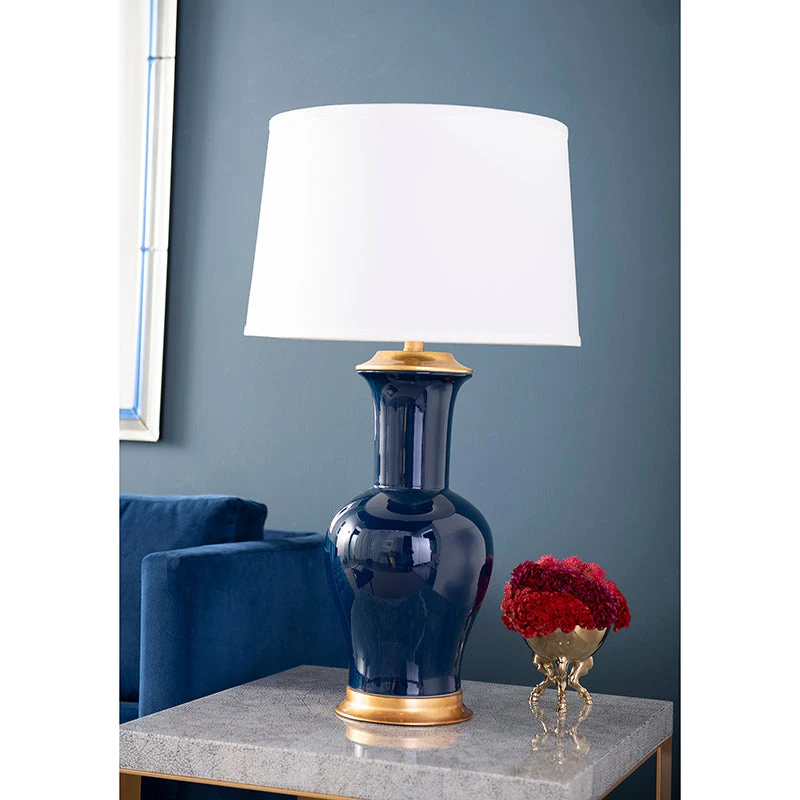 Elevate your space with the timeless elegance of our Cardiff Table Lamp. Featuring a high-gloss navy blue porcelain body, this lamp captures the artisanal charm of classic pottery while adding a sophisticated glow to any room. Gold leaf accents on the base and finial lend a touch of refinement, while the linen shade ensures soft, inviting light.Â