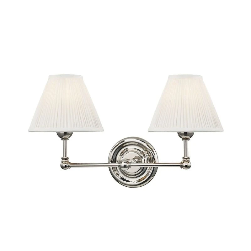 Distinctly approachable, this classic sconce by Mark D. Sikes infuses modern style with traditional. With delicate curves and pleated silk shades, this timeless design is perfectly suited for any space from a living room to a library.