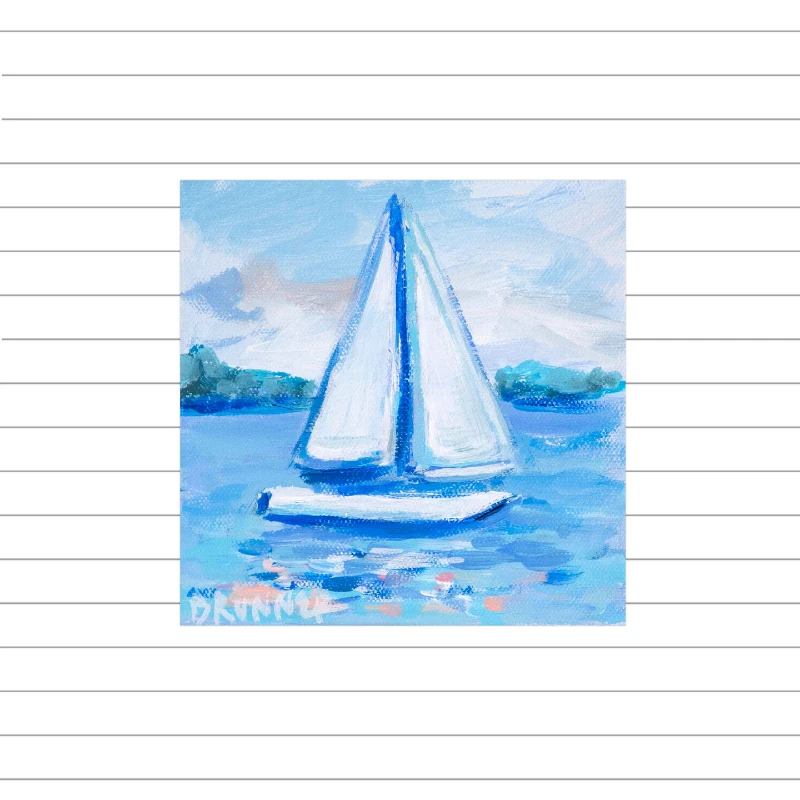 Coastal Calm is part of our popular Mini Series of original 6″ x 6″ paintings by Ohio-based artist Michelle Brunner. This one-of-a-kind piece captures a quiet moment at sea, with a single sailboat gliding across tranquil blue waters beneath an open sky, all rendered in Michelle’s signature impressionistic style.