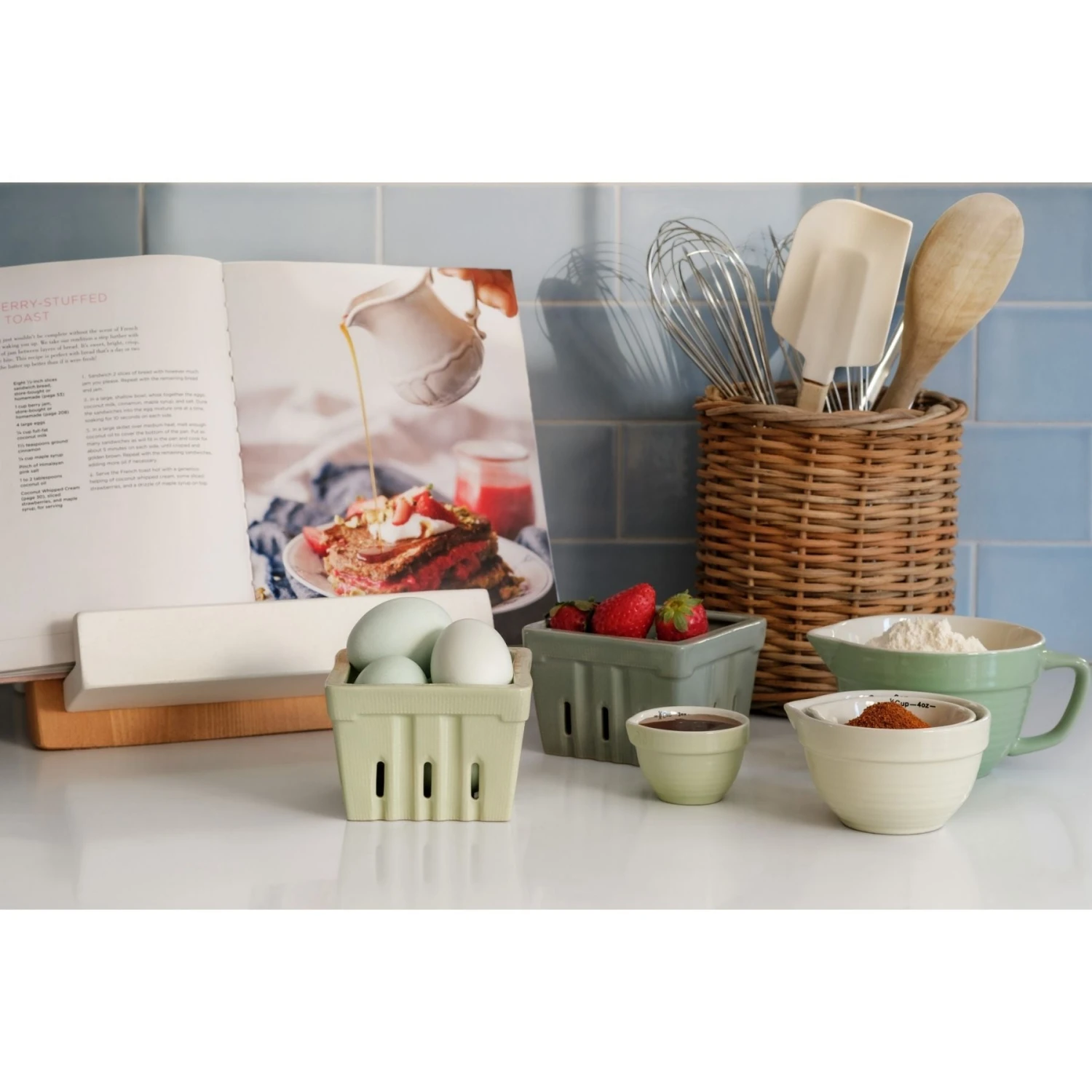 Inspired by vintage batter bowls, this set of stoneware measuring cups brings both charm and function to your kitchen. Designed with a subtle coastal palette, each cup is marked with measurements in ounces and cups, featuring a convenient V-shaped spout for easy pouring. Stackable for effortless storage and dishwasher-safe for everyday ease, these cups blend practicality with timeless style.
