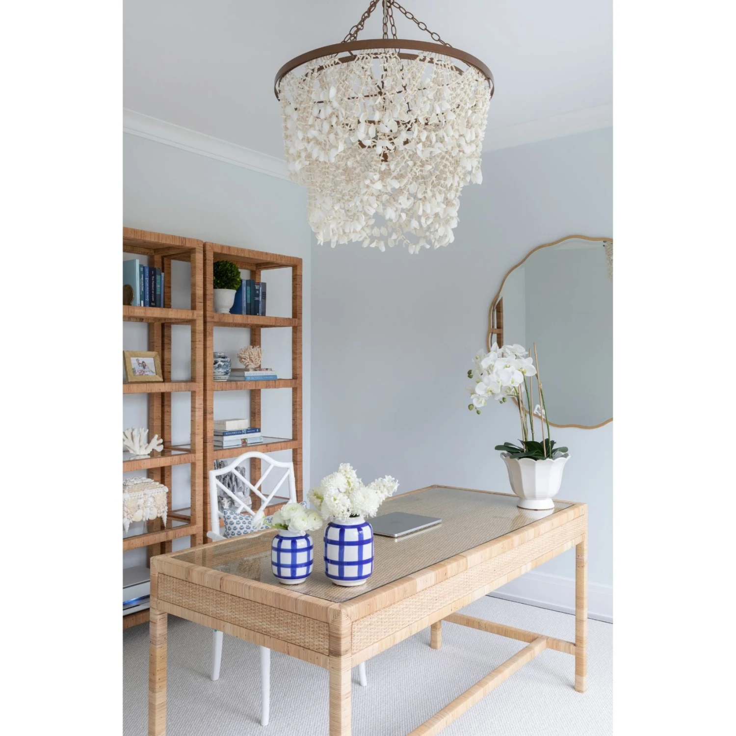 Our stunning Coquillage Chandelier takes Grecian draping to the dream realm with the overlapping lace-like strands of natural seashells. The swooping garlands of white cut clamshells hang and taper from a simple brass ring, creating a gorgeous pattern that turns casual materials into an elegant chandelier perfect for a dining room, master bedroom or any space you want to make a statement.Â