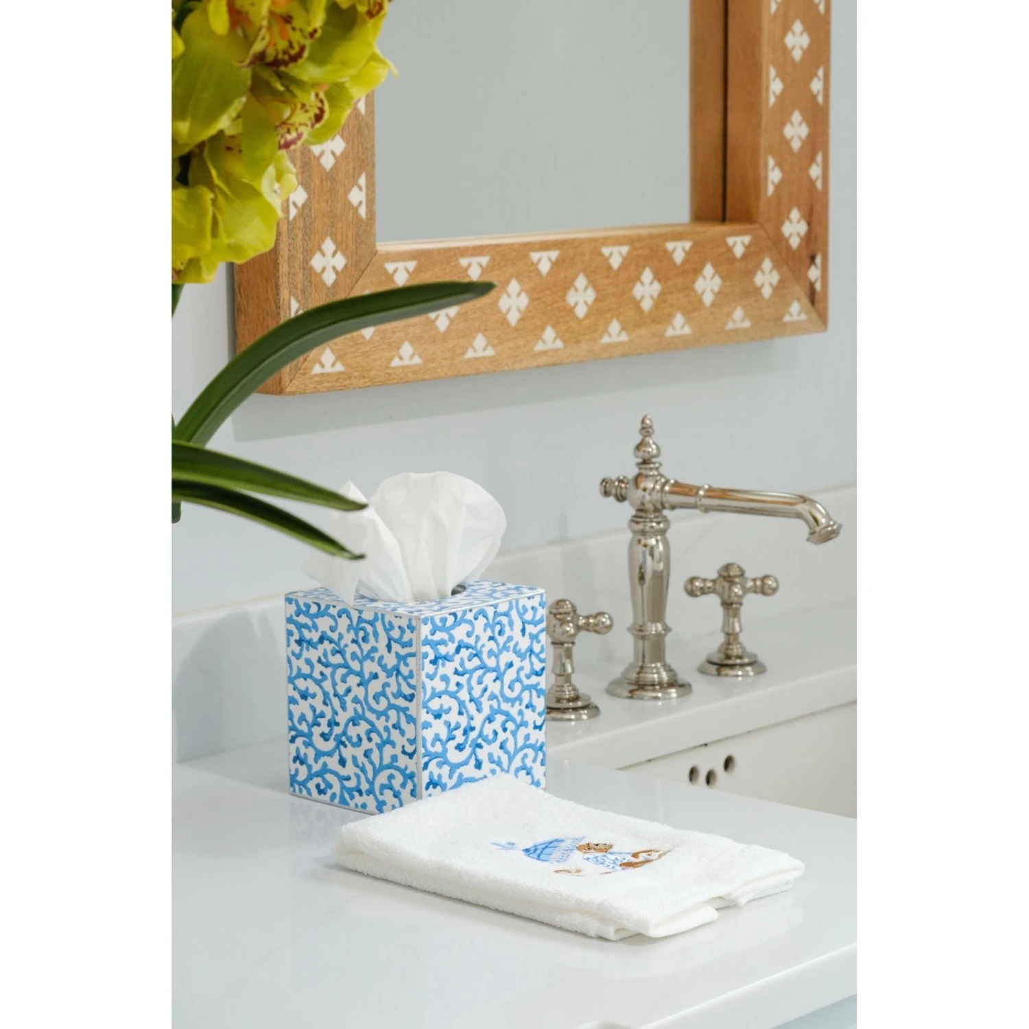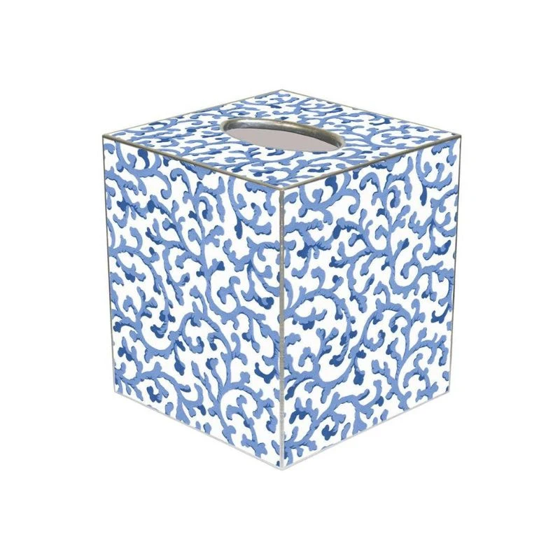 Our Coral Scroll decoupage tissue box cover makes a chic accent styled in a bathroom, kitchen, bedroom or office. Handmade in Texas, the artwork is hand-cut, decoupaged and polished. A hand painted silver edge serves as the finishing touch. Pair with our coordinating Coral Scroll Waste Basket.