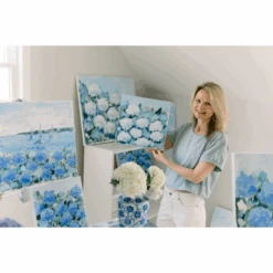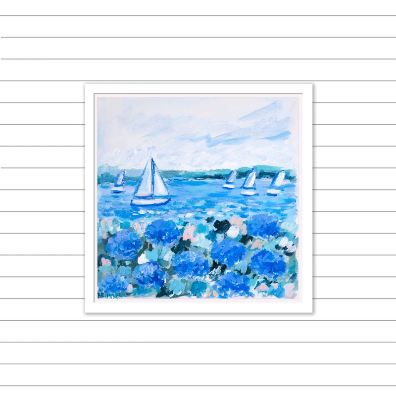 Cottage Breeze II is a one-of-a-kind original piece of art inspired by carefree life along the coast, with blooms of endless summer hydrangeas anchoring the foreground, while sailboats drift in the distance beneath a sun-washed sky. Painted on gallery wrapped canvas, this piece comes in a custom made white wood floater frame.