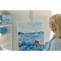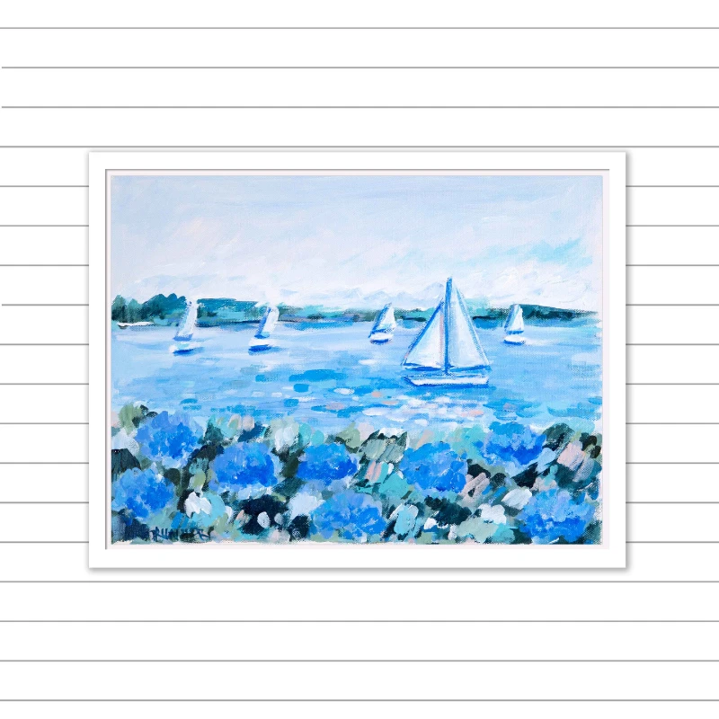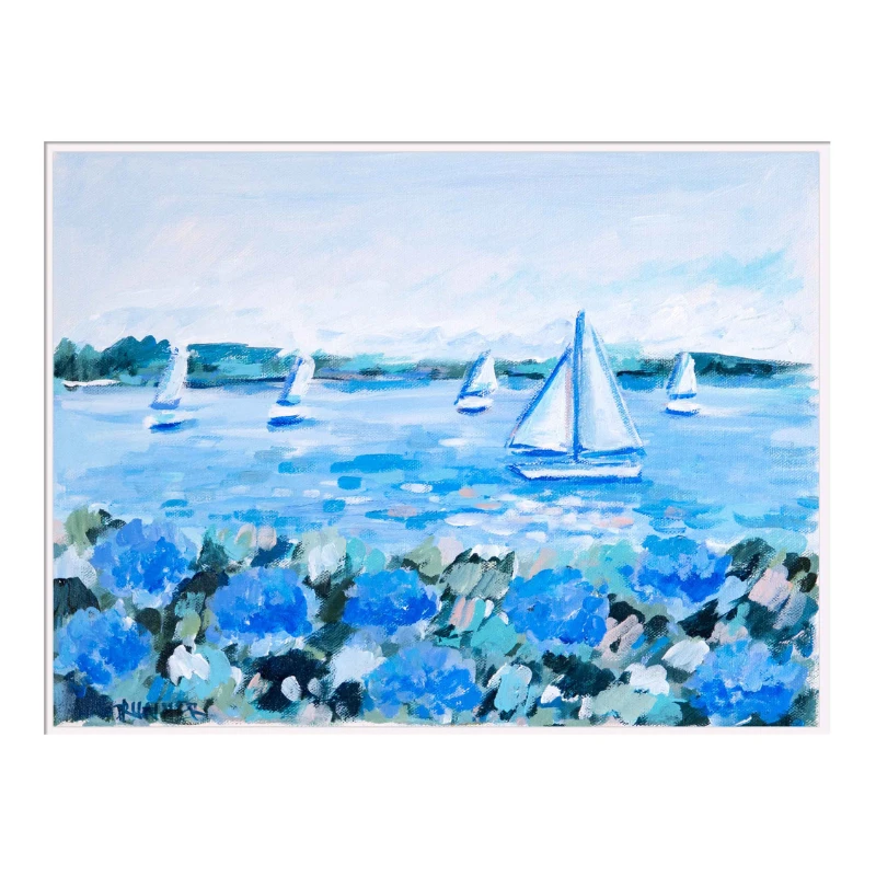 Cottage Breeze III is a one-of-a-kind original piece of art inspired by carefree life along the coast, with blooms of blue summer hydrangeas anchoring the foreground, while sailboats drift in the distance beneath a sun-washed sky. Painted on gallery wrapped canvas, this piece comes in a custom made white wood floater frame.