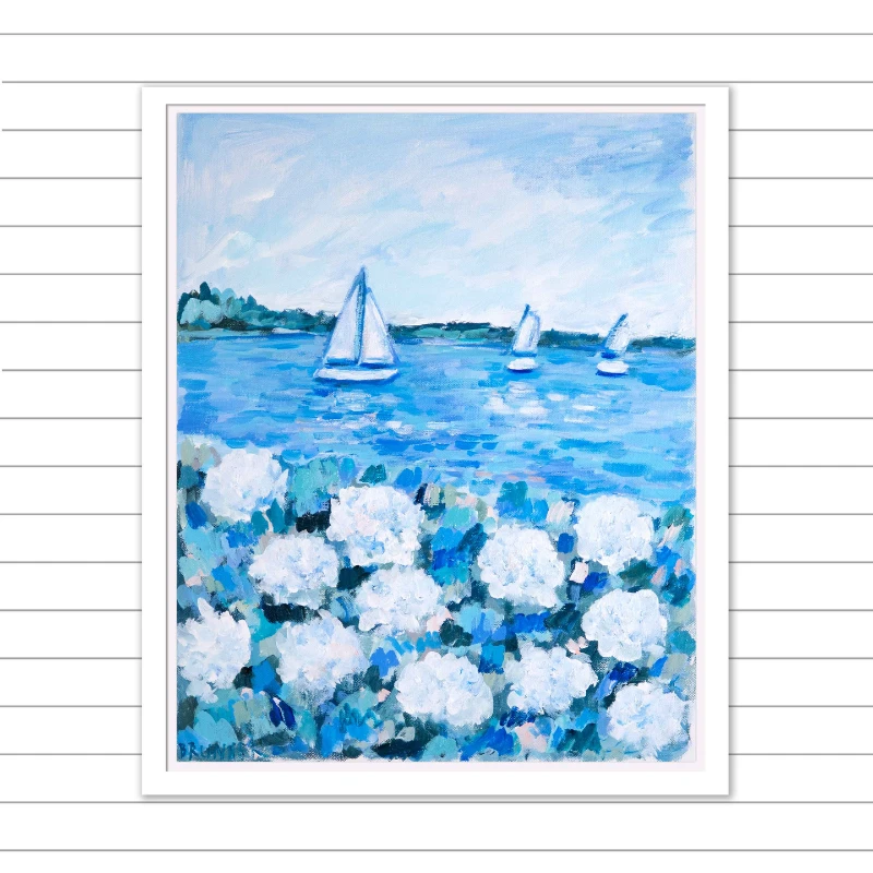 Cottage Breeze VII is a one-of-a-kind original piece of art inspired by carefree life along the coast, with blooms of endless summer hydrangeas anchoring the foreground, while sailboats drift in the distance beneath a sun-washed sky. Painted on gallery wrapped canvas, this piece comes in a custom made white wood floater frame.