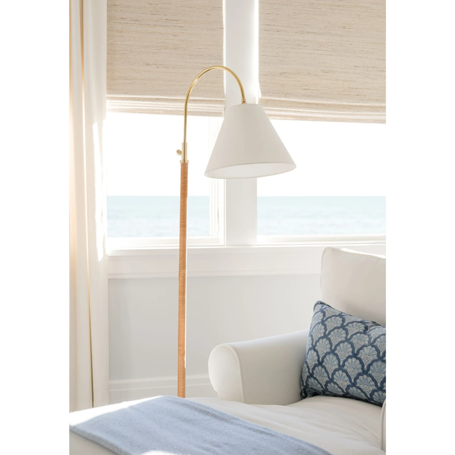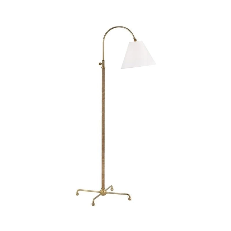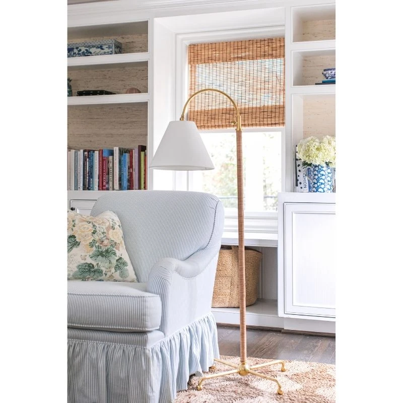 Designed by Mark D. Sikes, our Curves No.1 Floor Lamp offers a modern style with a coastal punch. Featuring a sleek curved arm and a unique 4-footed base, this stylish table lamp offers a modern organic feel with its aged brass finish accented in wrapped rattan. This distinguished floor lamp is perfectly at home in an office, beside a chaise, or a reading nook.