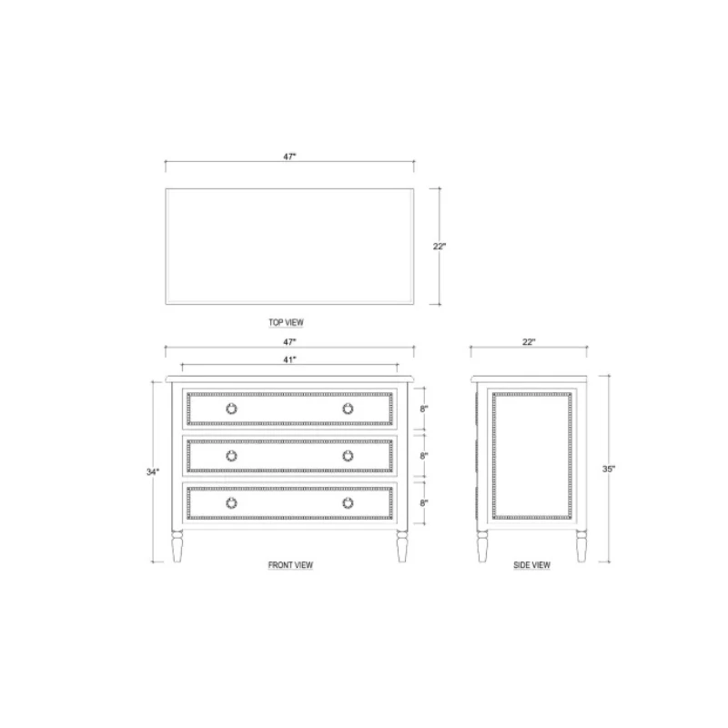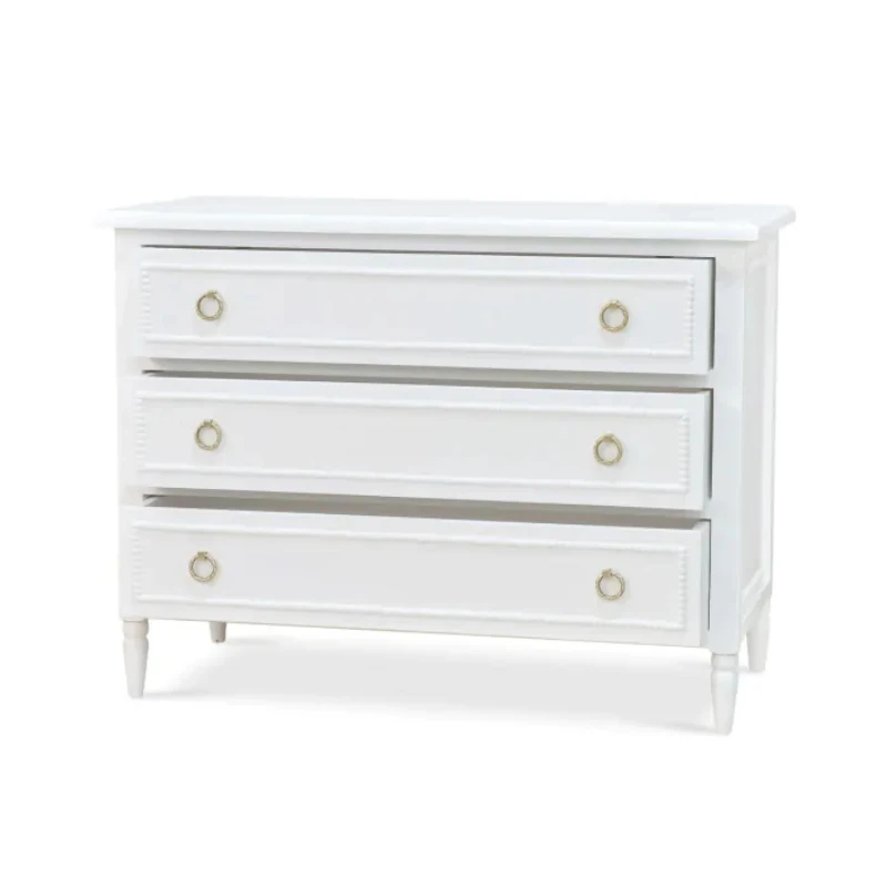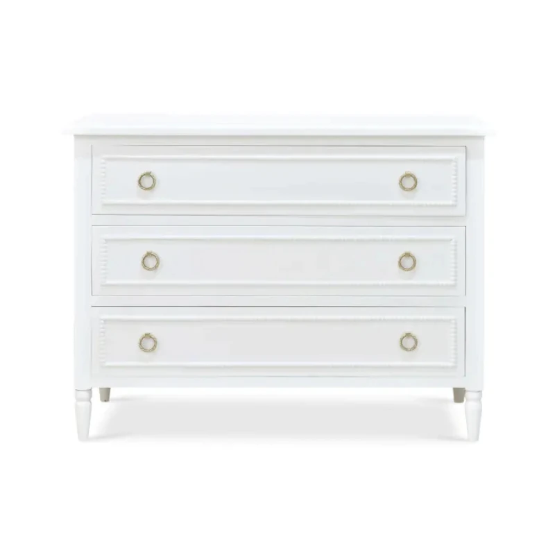Compact yet elegant, the Deauville 3-Drawer Dresser offers ample storage for smaller spaces while maintaining the timeless details of the collection. Featuring three spacious drawers with brass ring pulls and intricate wood bead detailing, this piece combines practicality with craftsmanship.