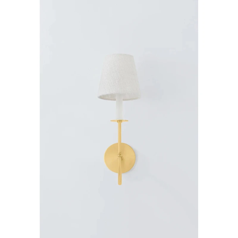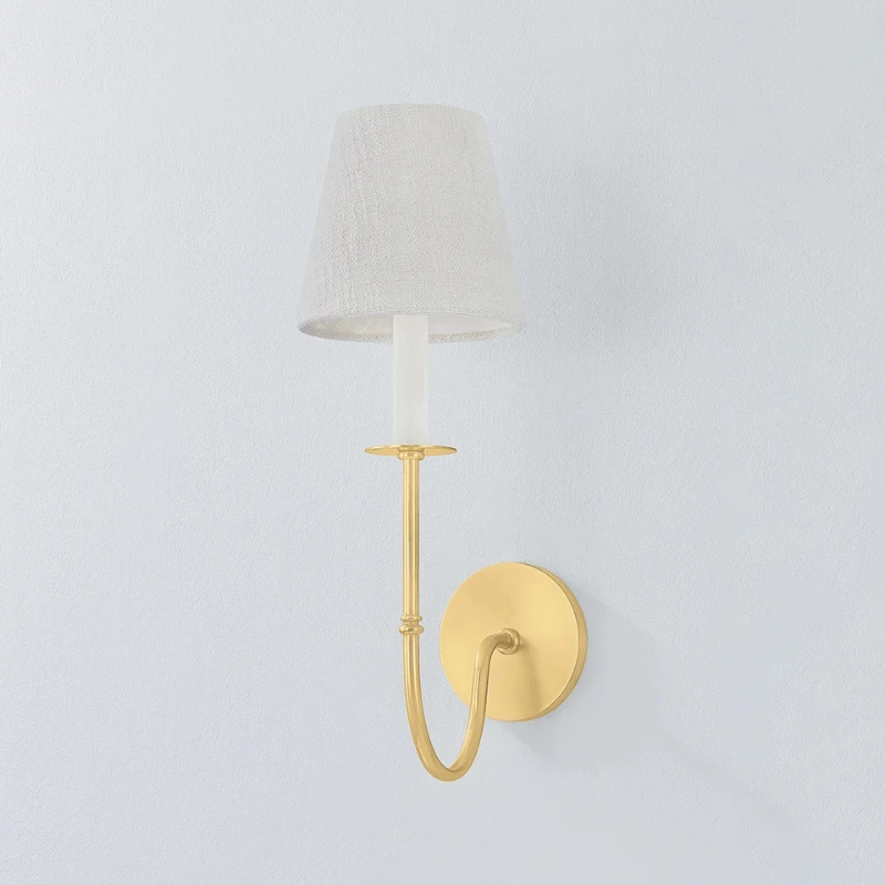 A timeless blend of vintage charm and modern elegance, the Devon Sconce reimagines classic Victorian metalwork with a contemporary twist. Its wide bobeches and intricate detailing are paired with sleek candle sleeves and short white linen shades. The Aged Brass finish highlights the slender, elongated J-arm, which gracefully curves to create a striking, sophisticated silhouette.