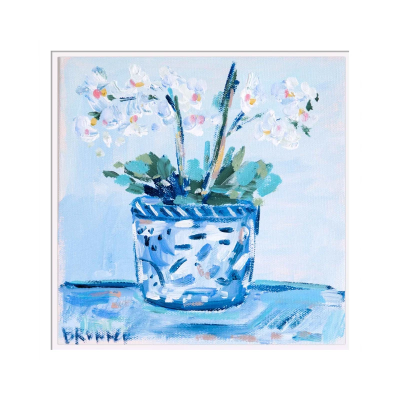 Elegant Orchid I s a one-of-a-kind original piece of art featuring white orchids arranged in a blue-and-white chinoiserie cachepot against a soft blue background, and perfect for adding a touch of elegance and tranquility to your home. Painted on gallery wrapped canvas, this piece comes in a custom made white wood floater frame.Â