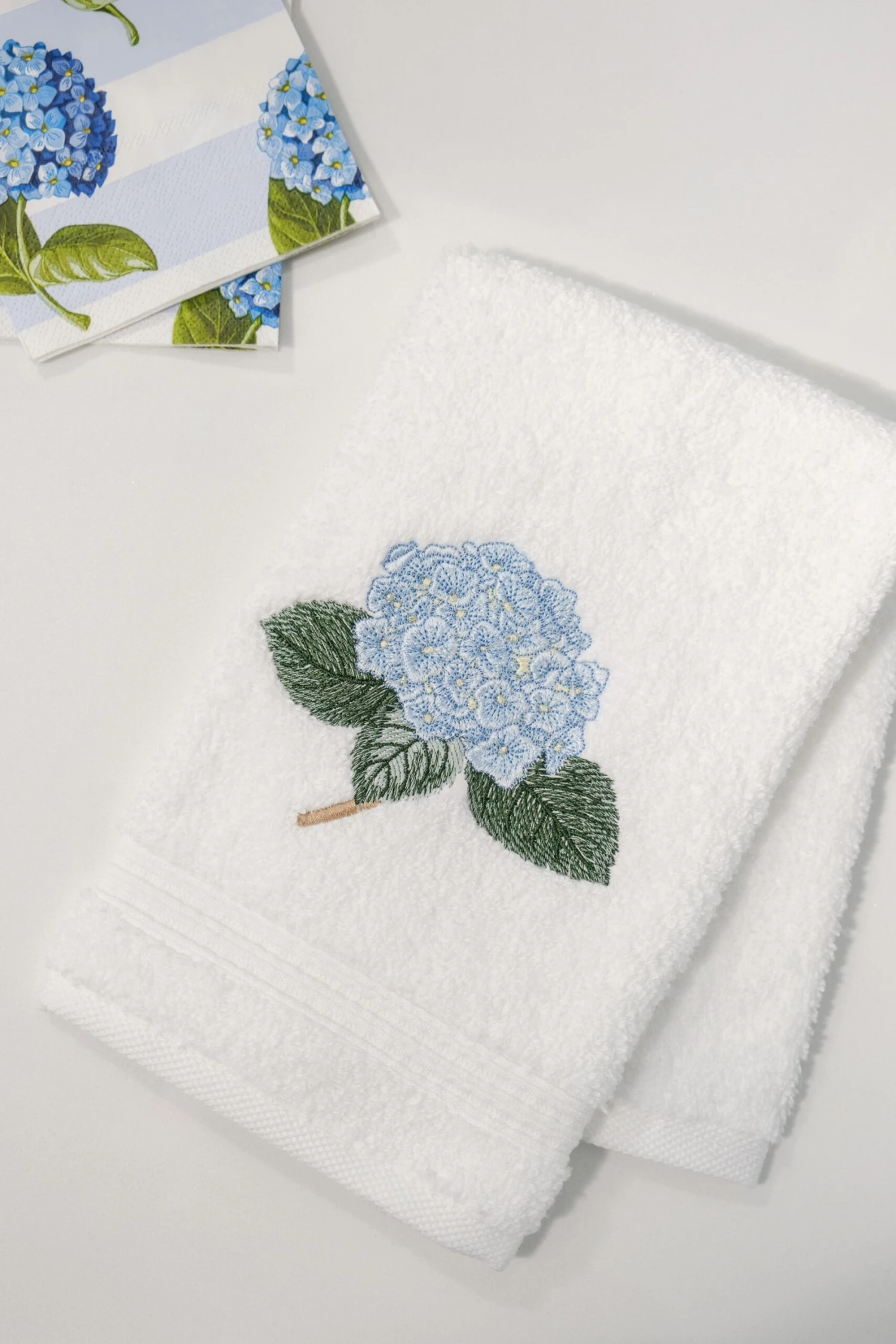 Featuring a hand embroidered hydrangea bloom, this chic guest towel is sure to delight! Crafted from 100% cotton, these plush terry guest towels are soft to the touch, highly absorbent, and exceptionally durable. Ideal for adding an elegant accent to any bathroom, whether in a powder room or primary suite, these towels combine luxury with easy care.