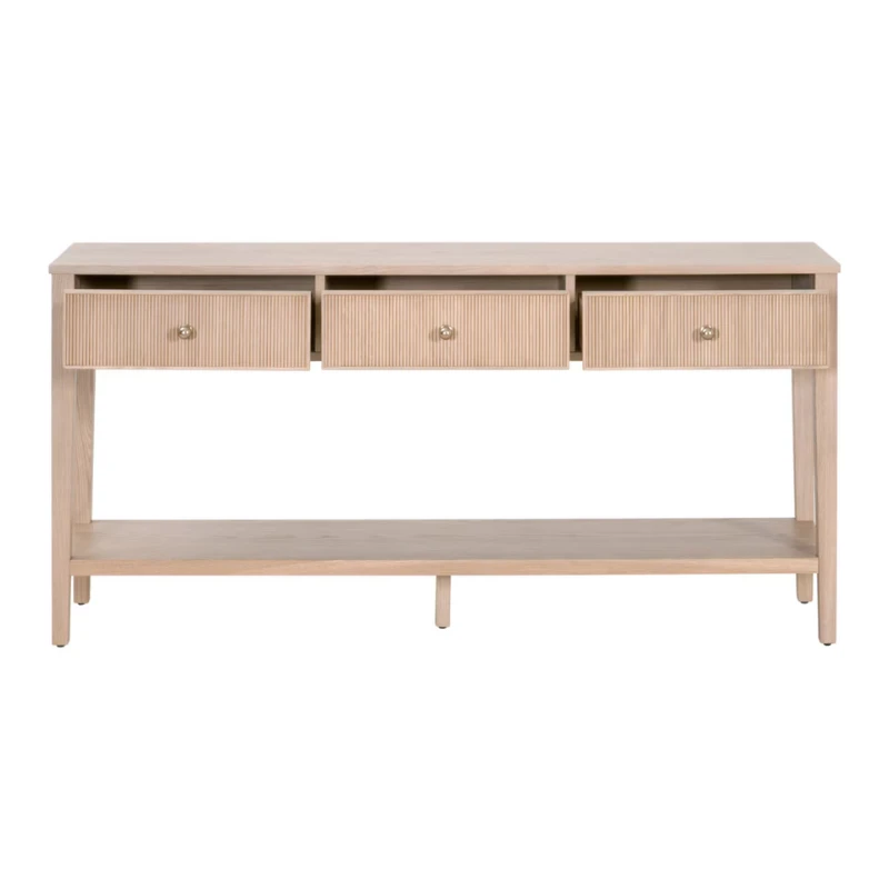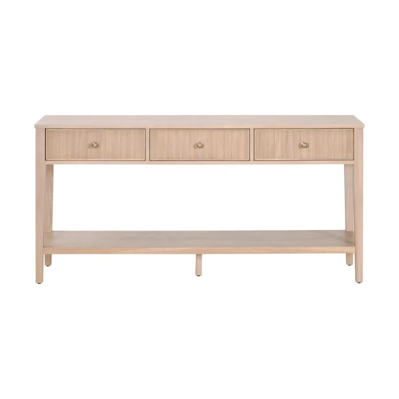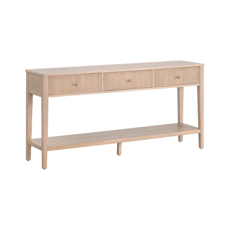 A quietly refined piece with everyday versatility. The Encinitas Console is crafted from solid oak with reeded drawer fronts for added texture and warmth. With three drawers and a lower shelf for extra storage, it’s ideal for grounding an entryway, hallway, or behind the sofa—bringing a soft, natural finish to any space.