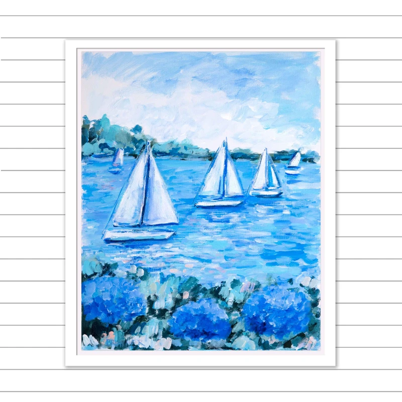 Endless Summer Regatta is a one-of-a-kind original artwork capturing the charm of a coastal summer in full swing, as blue hydrangeas bloom in the foreground, while a regatta of sailboats visible along the horizon. Painted in an impressionistic style Painted on gallery wrapped canvas, this piece comes in a custom made white wood floater frame.