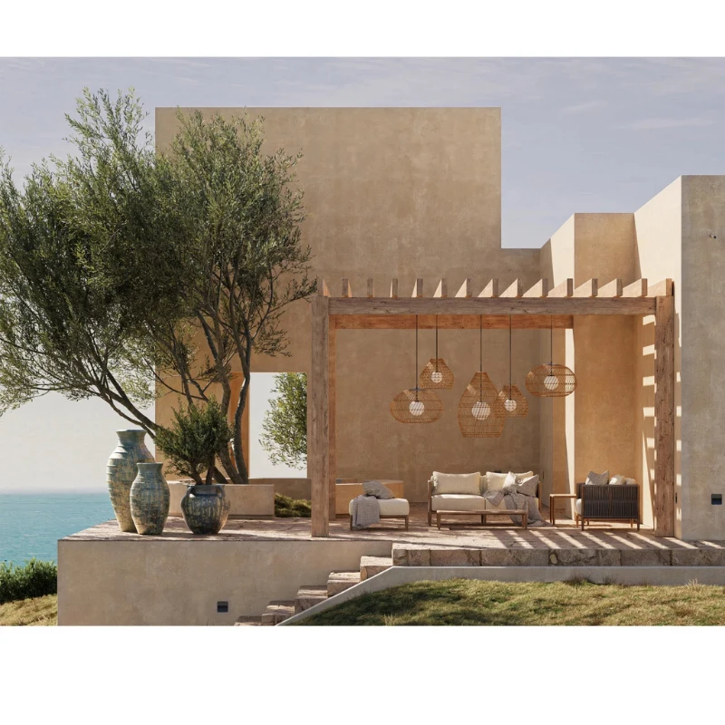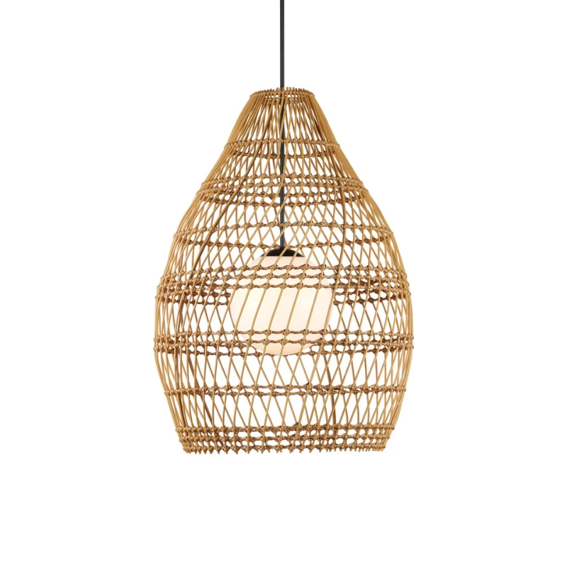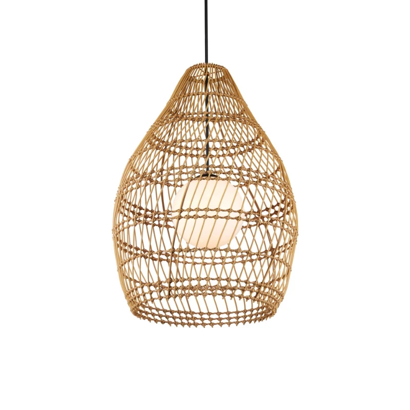 Inspired by traditional fish traps, this sculptural pendant adds striking texture and form to outdoor spaces. Handwoven from durable, all-weather wicker, the pear-shaped shade features a dynamic, angled weave that creates a sense of movement, subtly echoing the motion of ocean currents. A black powder-coated metal frame ensures lasting performance in the elements, while the generous scale makes it a true statement piece for expansive patios, porches, or covered outdoor rooms. Wet-rated and effortlessly coastal, the Fishtrap is where artisanal craftsmanship meets functional beauty.
