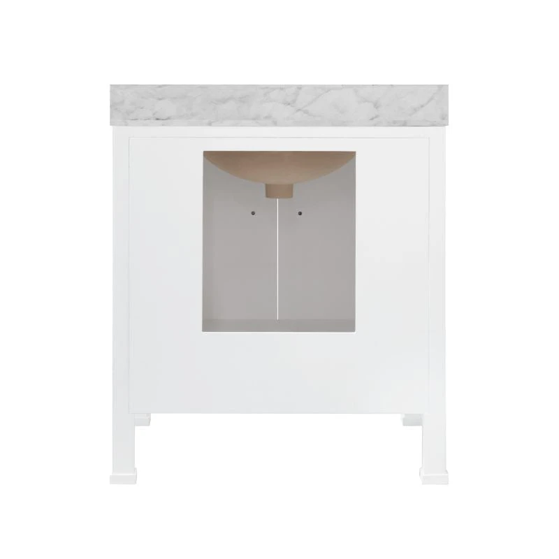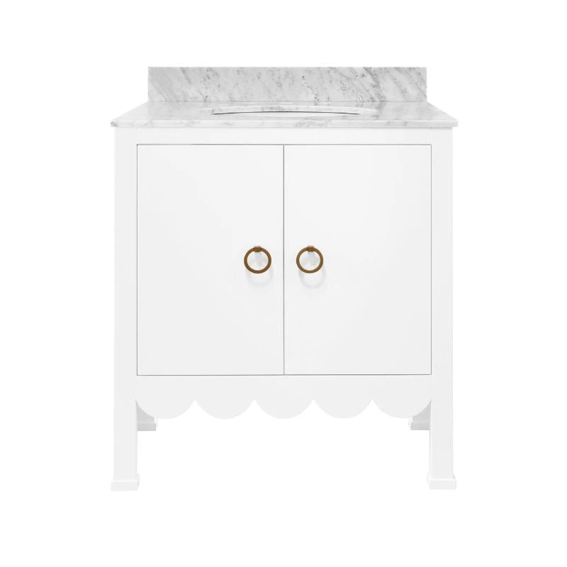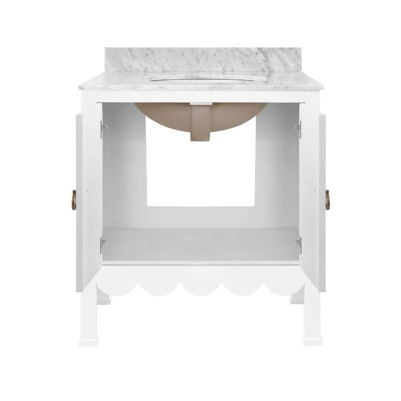 Infused with coastal charm, the Horizon Bathroom Vanity features a whimsical scallop detail that adds a touch of playful sophistication to its design. Crafted for those who cherish both style and convenience, this freestanding bathroom vanity boasts a Carrara marble top, porcelain sink, and satin brass ring hardware, exuding a timeless coastal aesthetic with a modern twist.