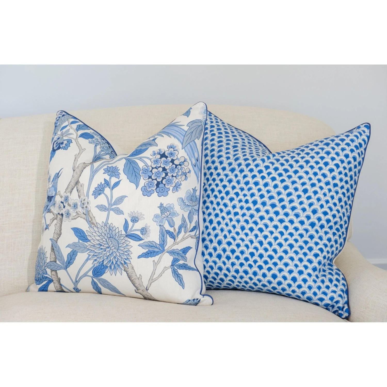 Our Hydrangea Blue Bird Pillow features a beautiful floral and bird motif and contrast pipping. Made of a 100% linen with a plush feather insert and hidden zipper enclosure, this traditional style pillow features its floral pattern on the front and a solid ivory backing. Whether placed on a sofa, armchair, or bed, this pillow is sure to become a cherished accent piece. Designed to be mixed and matched with other patterns to elevate your interior.