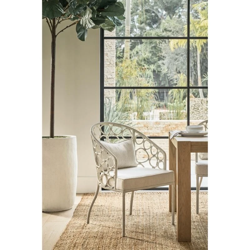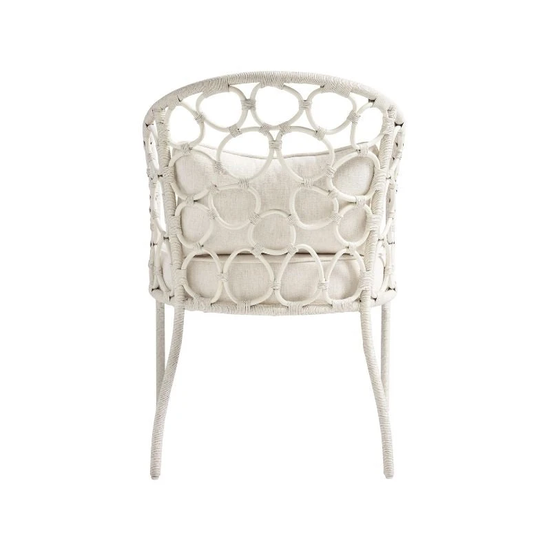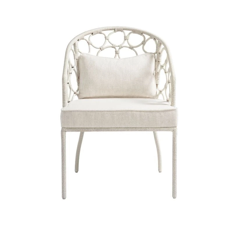 Discover the charm of the Kaho’olawe Armchair in White, where elegant design meets comfort. Woven rattan forms a series of circles for a soothing visual appeal, paired with an upholstered seat and a lumbar pillow for added comfort. Upholstered in a durable Crypton fabric blend, this armchair is a stylish, cozy addition to any space.