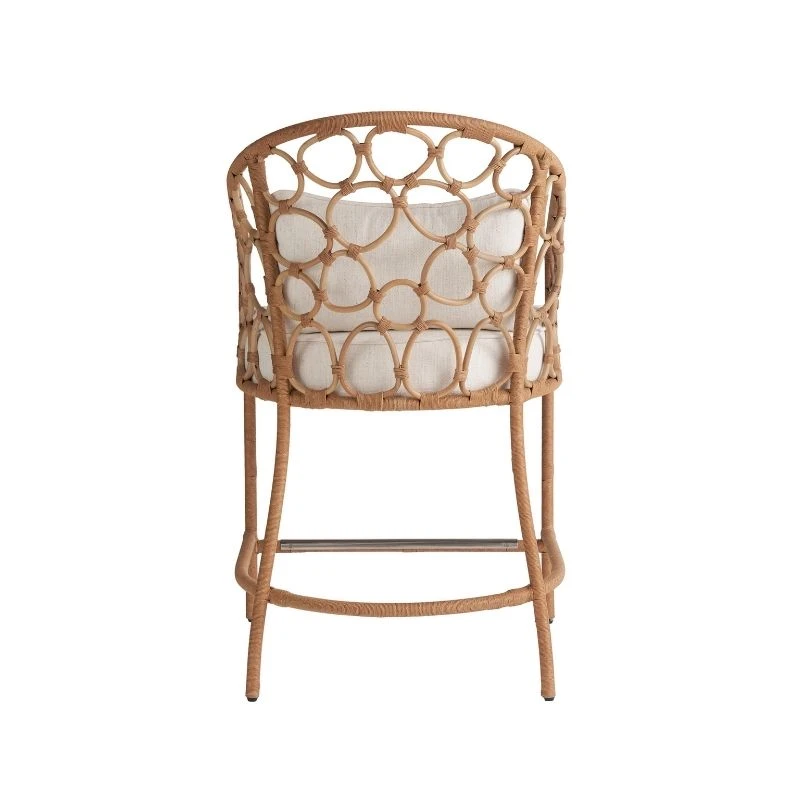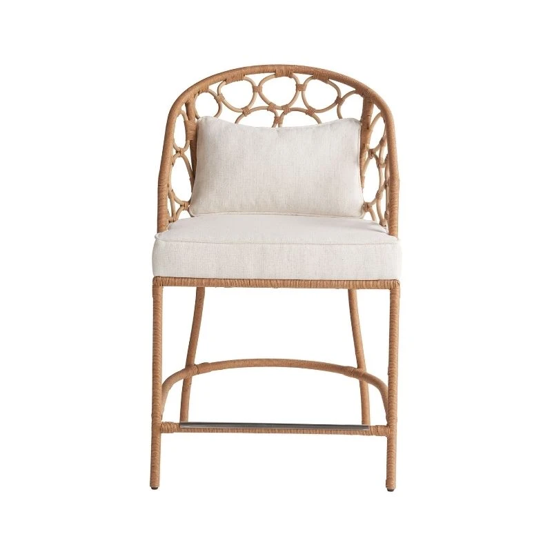 Discover the chic, laid-back charm of the Kaho’olawe Counter Stool. Woven rattan circles create a calming pattern, paired with a comfy upholstered seat and a stylish lumbar pillow.