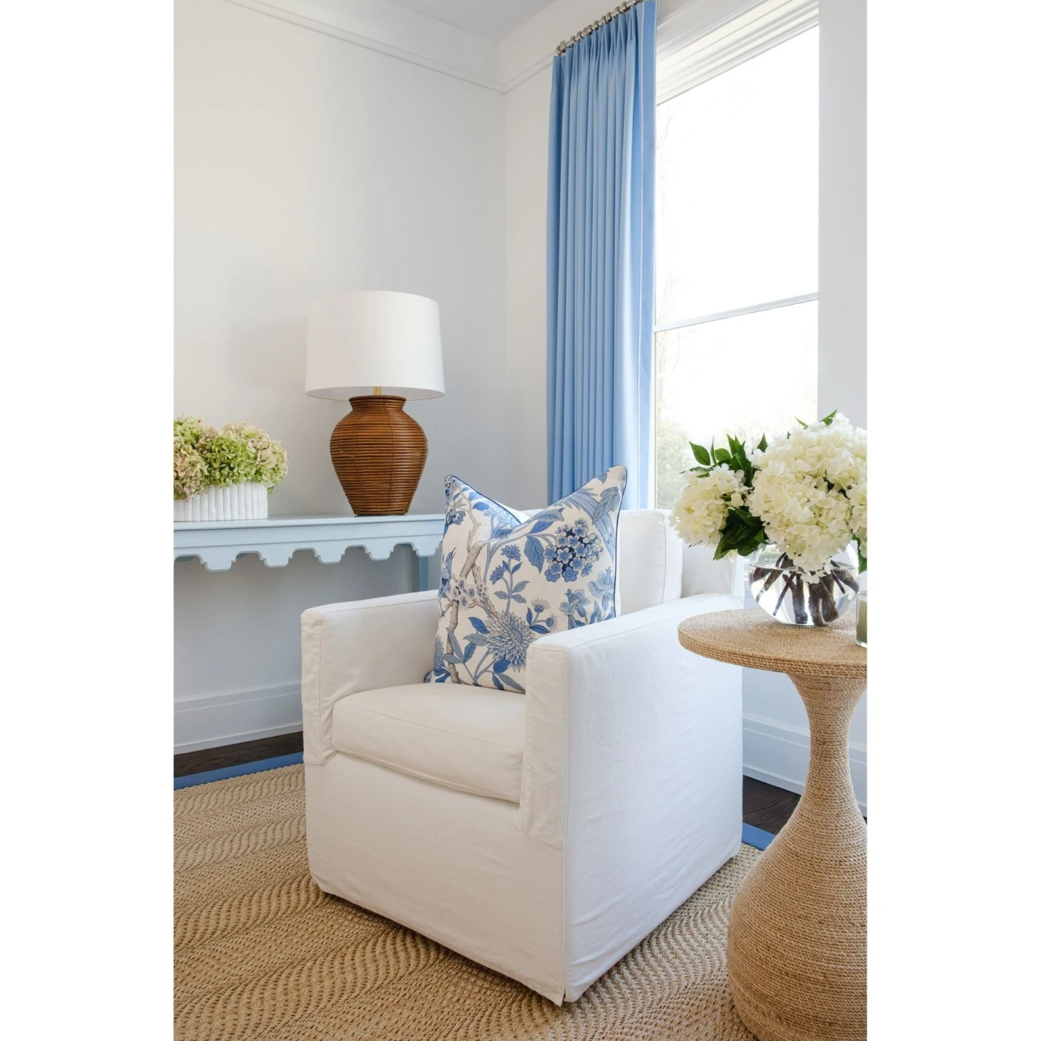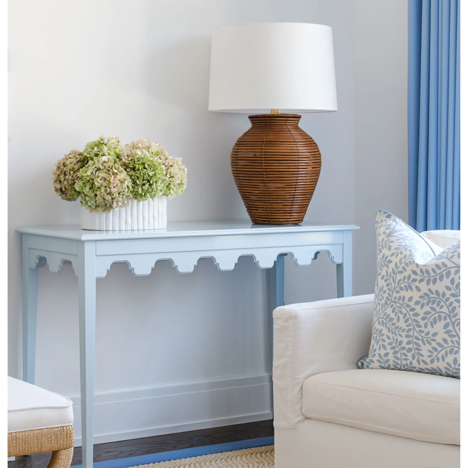 Make a statement with our striking Kapalua Table Lamp. The large scale natural rattan base pairs with a white Belgian linen shade to bring an overall softness and organic feel to the piece, adding a touch of the islands to any interior.