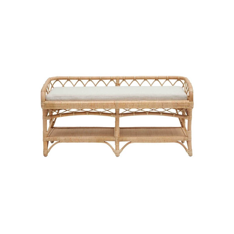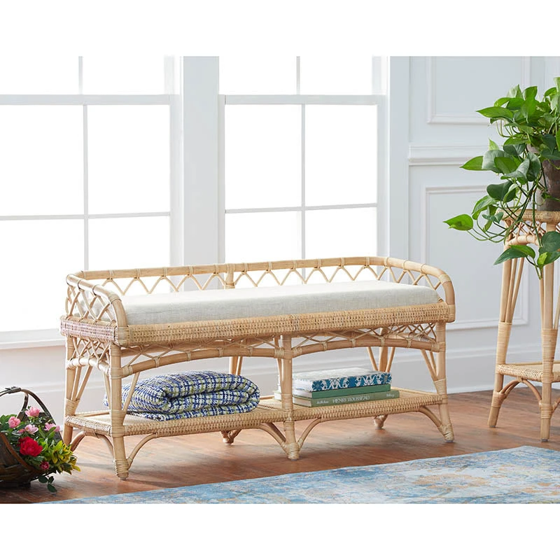 Serve up coastal style in the comfort of home with our Key West Bench. Crafted from woven rattan, the piece adds a textural quality and a tropical punch.   The bottom shelf affords an extra storage opportunity, perfect for styling coffee table books. Constructed from natural materials, the furniture may have minor variations in color, texture, and beauty marks, which enhances its natural charm.Â