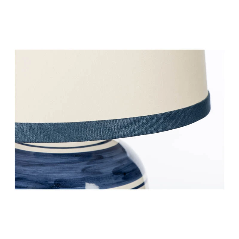 Our La Jolla Table Lamp is the perfect finishing touch for a coastal bedroom, living area or entryway. This navy and white stripe lamp is both classic and nautical with its unique and artistic brushstroke details. A lovely egg linen drum shade features a navy blue trim across its top and bottom adding interest and charm.