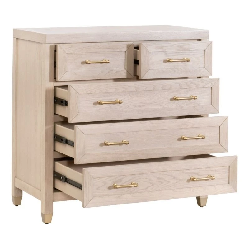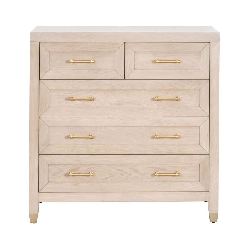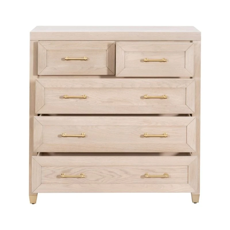 Our Lake House Tall Dresser lets you store your clothing in high style. Bleached wood and brass hardware make it at home at a lake house, beach house, or really, any house. Constructed from natural materials, this piece may have minor variations in color, texture, and beauty marks, which enhances its natural charm.Â