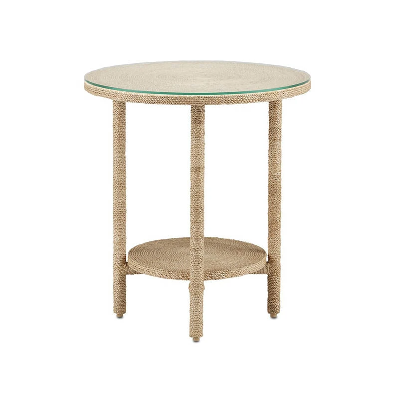 The wrought iron and wood frame of the Limay Accent Table is wrapped in natural abaca rope. The precision with which artisans cover the vertical and horizontal lines and the disk elements on the rope accent table is accomplished with a painstaking focus that is a hallmark of refined handicrafts. The Limay is topped with a clear piece of glass to keep the top protected from stains.