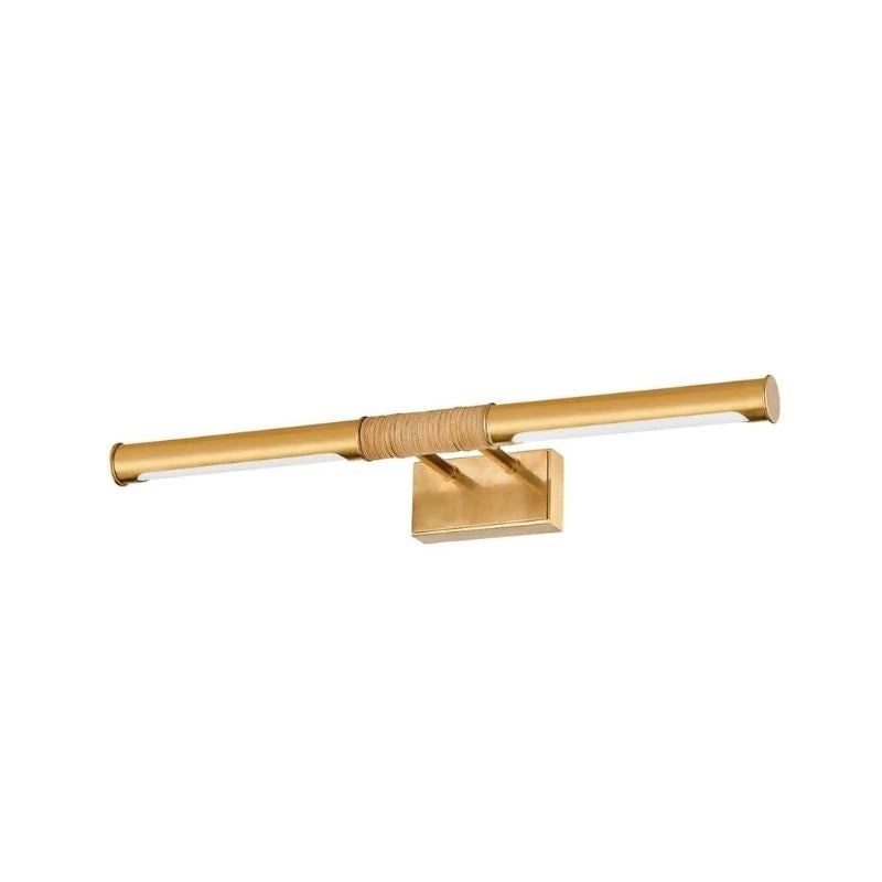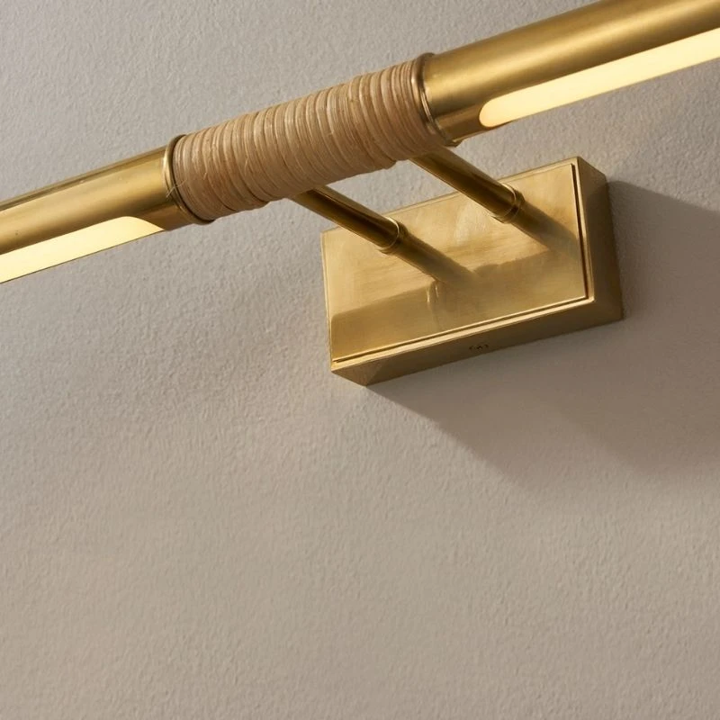 Rattan wrapping at the center gives this traditional picture light design an updated, natural feel while still keeping it classic and versatile. Available in two sizes, this designer essential and trend-forward fixture looks at home over mirrors, art, bookshelves and more. Due to the one-of-a-kind nature of the natural rattan, exact colors and patterns may vary slightly from the image shown.
