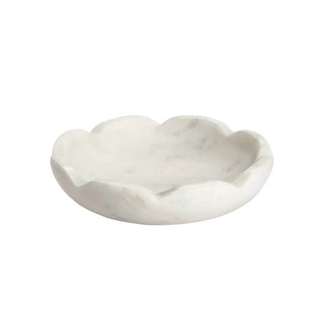 Our beautiful Scallop Dish is made from white marble with natural purple and grey veins and a feminine scallop edge. This delicate dish is ideal to hold your trinkets, jewelry or round soap in a bathroom or near a kitchen sink.