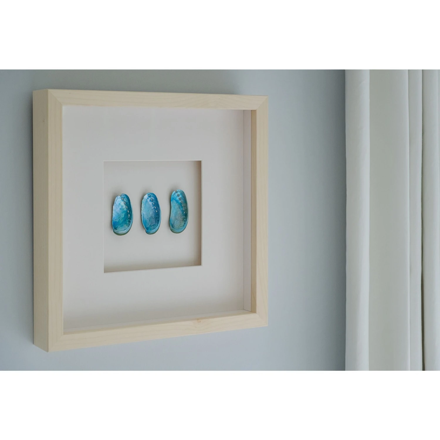 Capture the beauty of the sea with our Mini Pearl Abalone Shell Framed Art. Featuring three small natural jade abalone shells mounted on white board and framed in a custom maple wood frame, this beautiful piece will add a touch of the coast wherever it’s place.