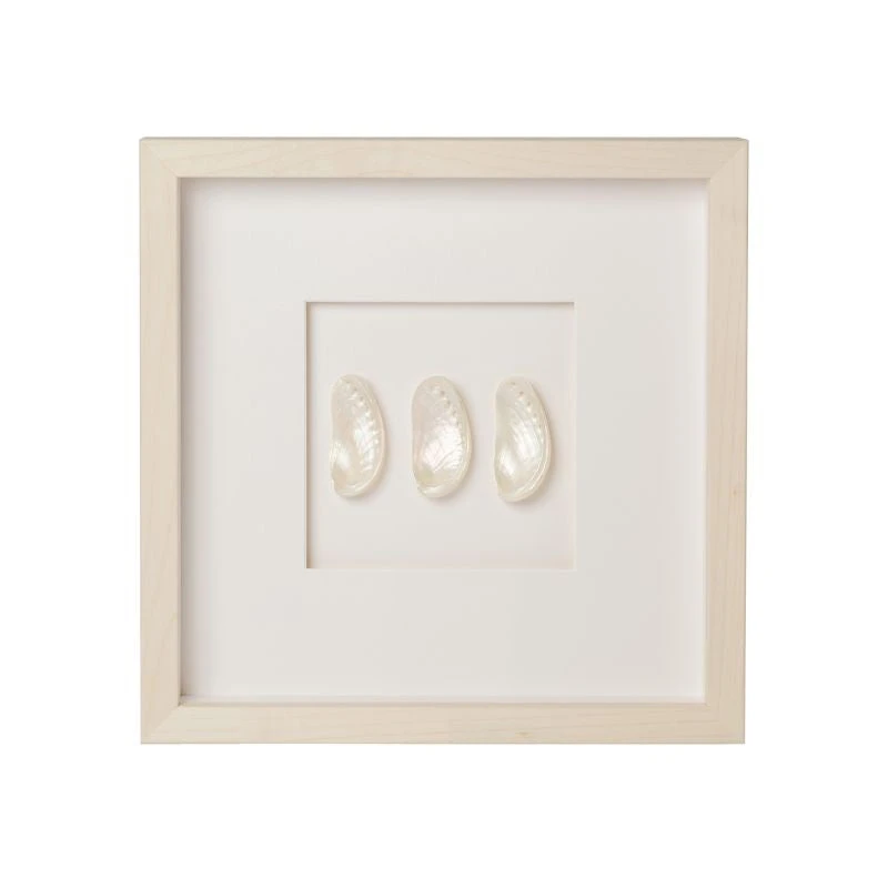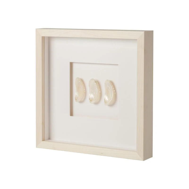 Capture the beauty of the sea with our Mini Pearl Abalone Shell Framed Art. Featuring three small natural pearl abalone shells mounted on white board and framed in a custom maple wood frame, this beautiful piece will add a touch of the coast wherever it’s place.Â