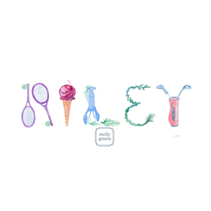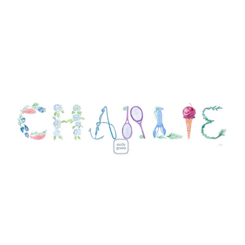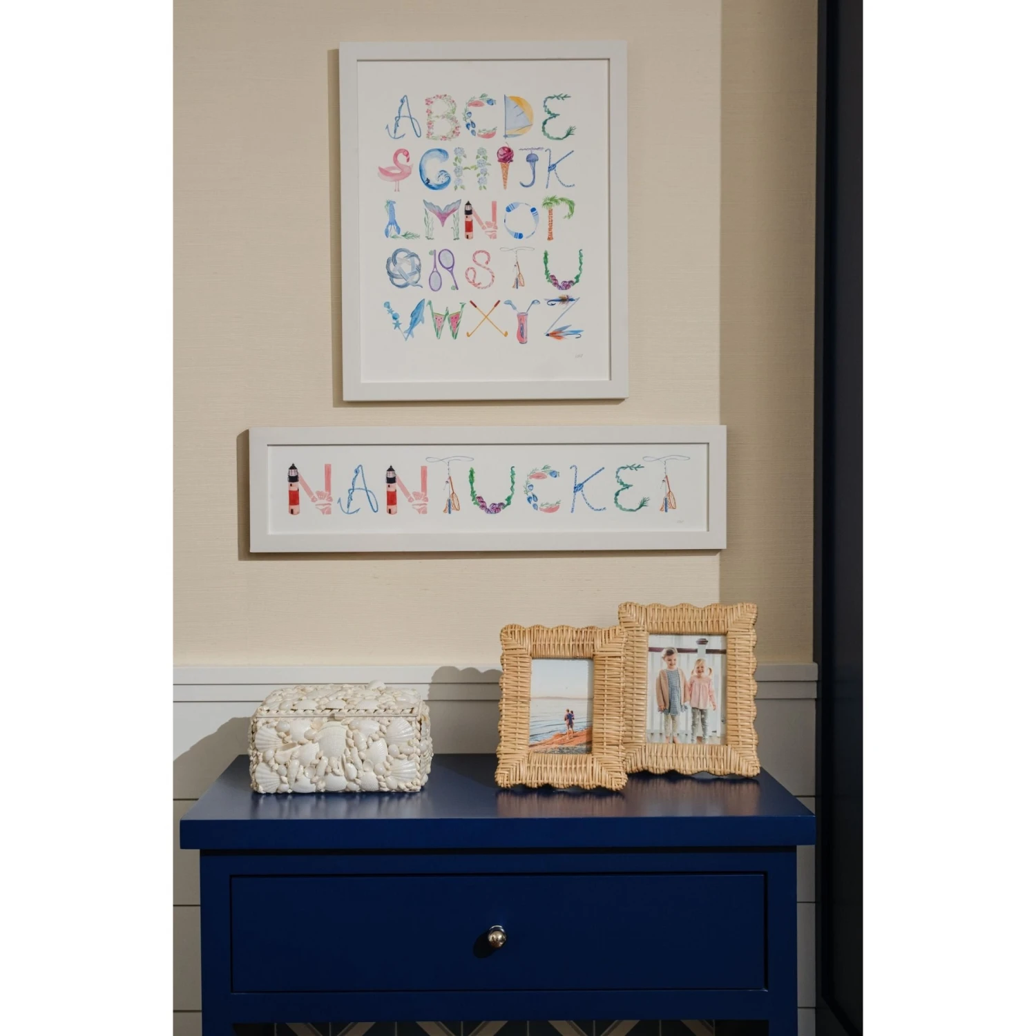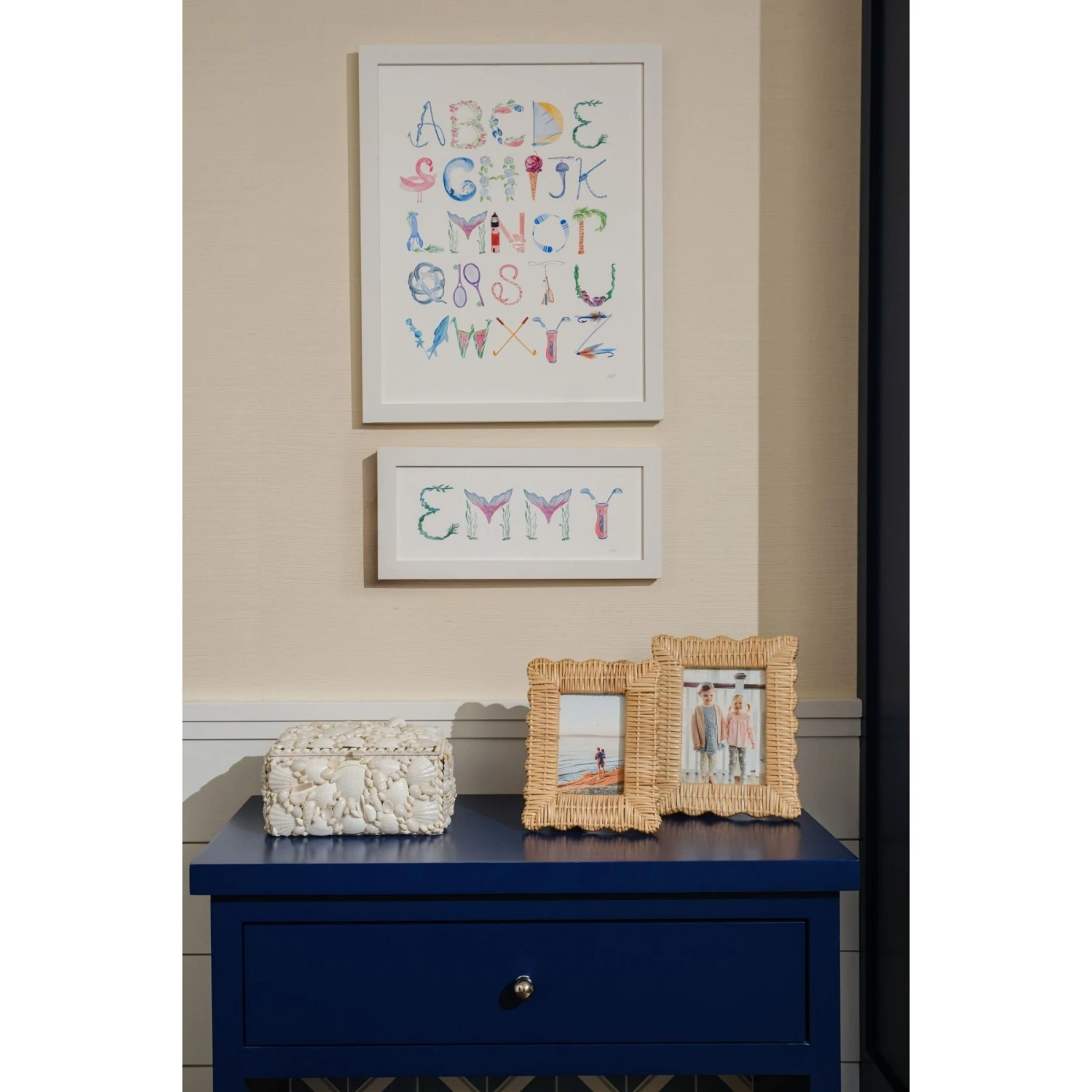 Personalize your space with our unique Custom Framed Art, featuring the charmingly illustrated letters from our Coastal Alphabet Collection by Mollygrams. Create your own special message, whether it’s a child’s name, a beloved beach destination, or a favorite phrase, with each letter represented by delightful coastal motifs. The size of the framed print adjusts to accommodate your chosen word, ensuring a perfectly tailored piece every time. This customizable artwork is ideal for adding personalized charm to beach or lake houses, mudrooms, bathroom, nurseries, playrooms, and beyond! It makes a thoughtful personalized gift for special occasions spelling someone’s name or a way to celebrate their personal connection to the sea.