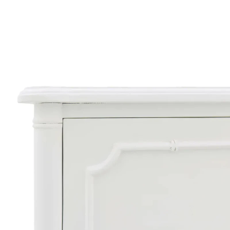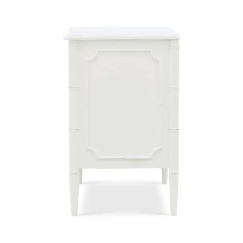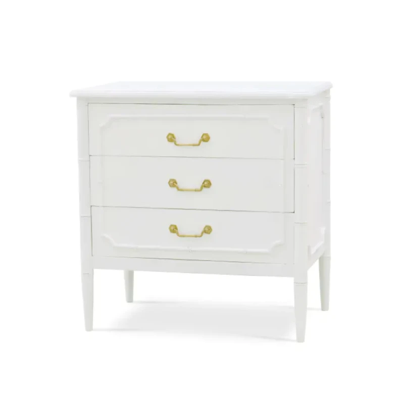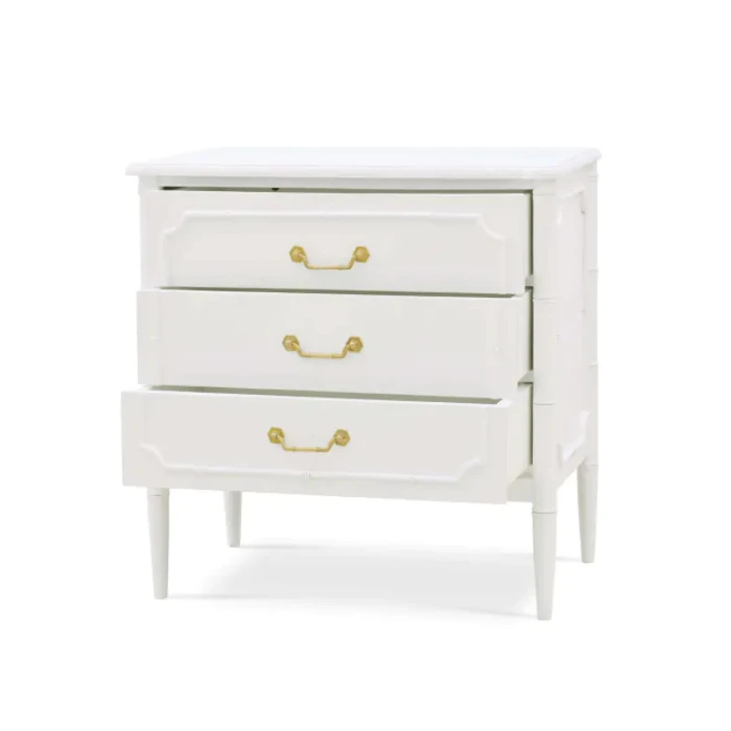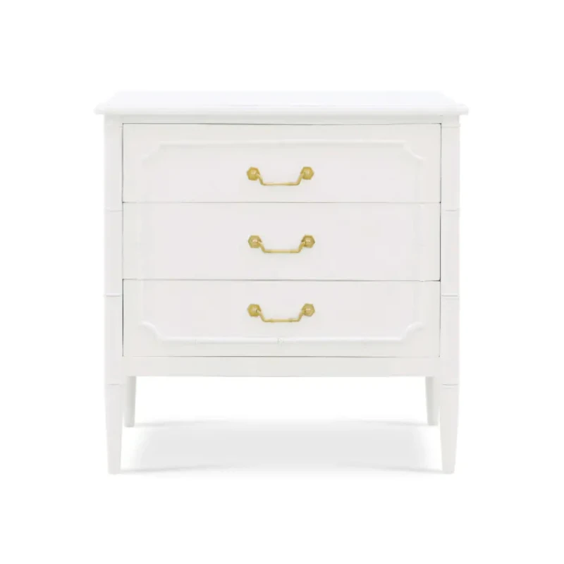 Bring timeless elegance to your bedroom with the Monaco Nightstand. Featuring a fresh white finish with light distressing and bamboo-inspired detailing, this piece combines coastal charm with classic sophistication. The three spacious drawers provide ample storage for your bedside essentials, while the detailed hardware adds a touch of refined luxury.