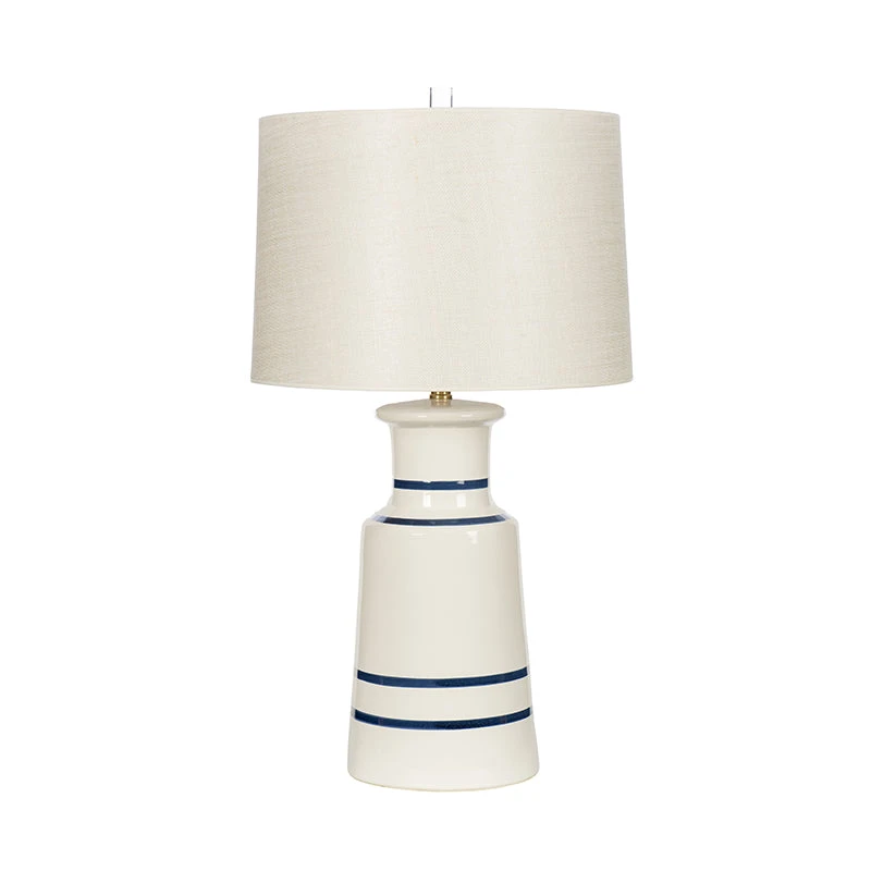 Our nautical inspired Montauk Table Lamp features a delicate off-white ceramic body with subtle, hand painted blue striping, adding a touch of seaside charm. Topped with a cream linen drum shade, it offers a coastal casual ambiance to a bedroom, main living area, or entryway.